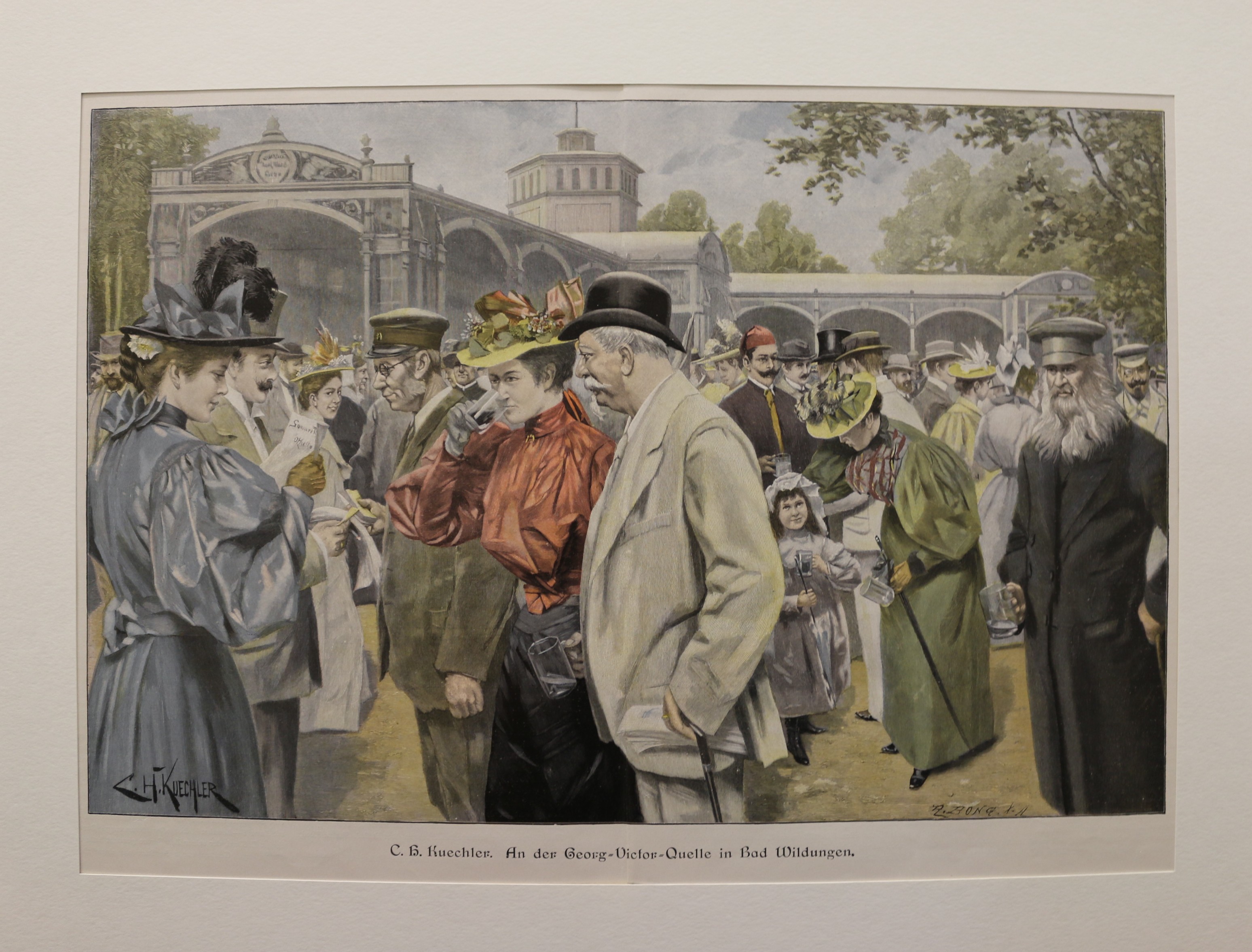 Bad Wildungen: Heilwasserquelle: An der Georg-Victor-Quelle in Bad Wildungen. Farbiger Holzstich nach Kuechler von Bong, um 1890. 30 x 45,5 cm. Prima erhalten. Auf Wunsch mit Passepartout im Format 45 x 55 cm.