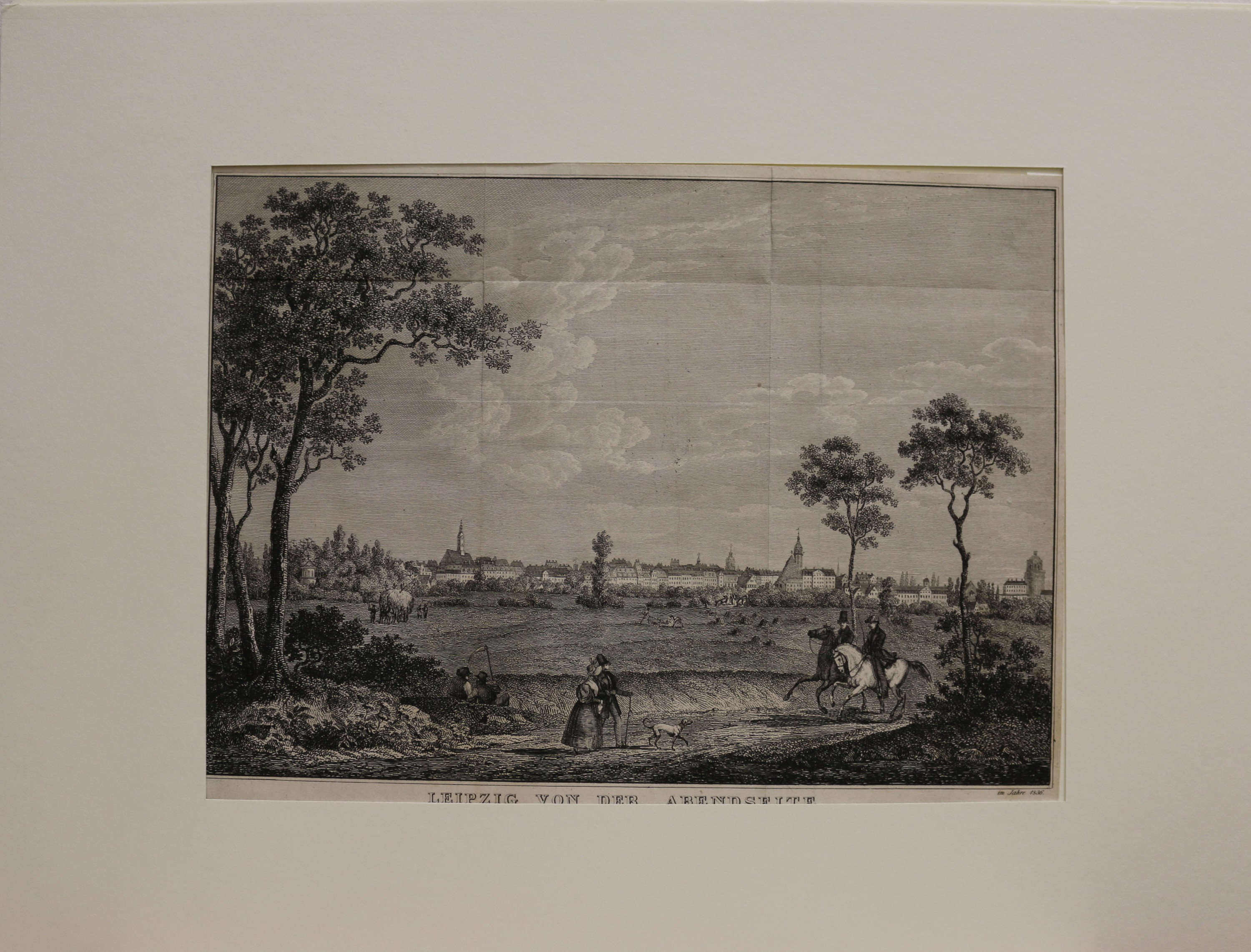Leipzig: Gesamtansicht: Leipzig von der Abendseite. Kupferstich anonym, um 1836. 18,5 x 26 cm. Das Blatt ist gefaltet gewesen so wie es im Buch erschienen ist. Seltene Vedute.