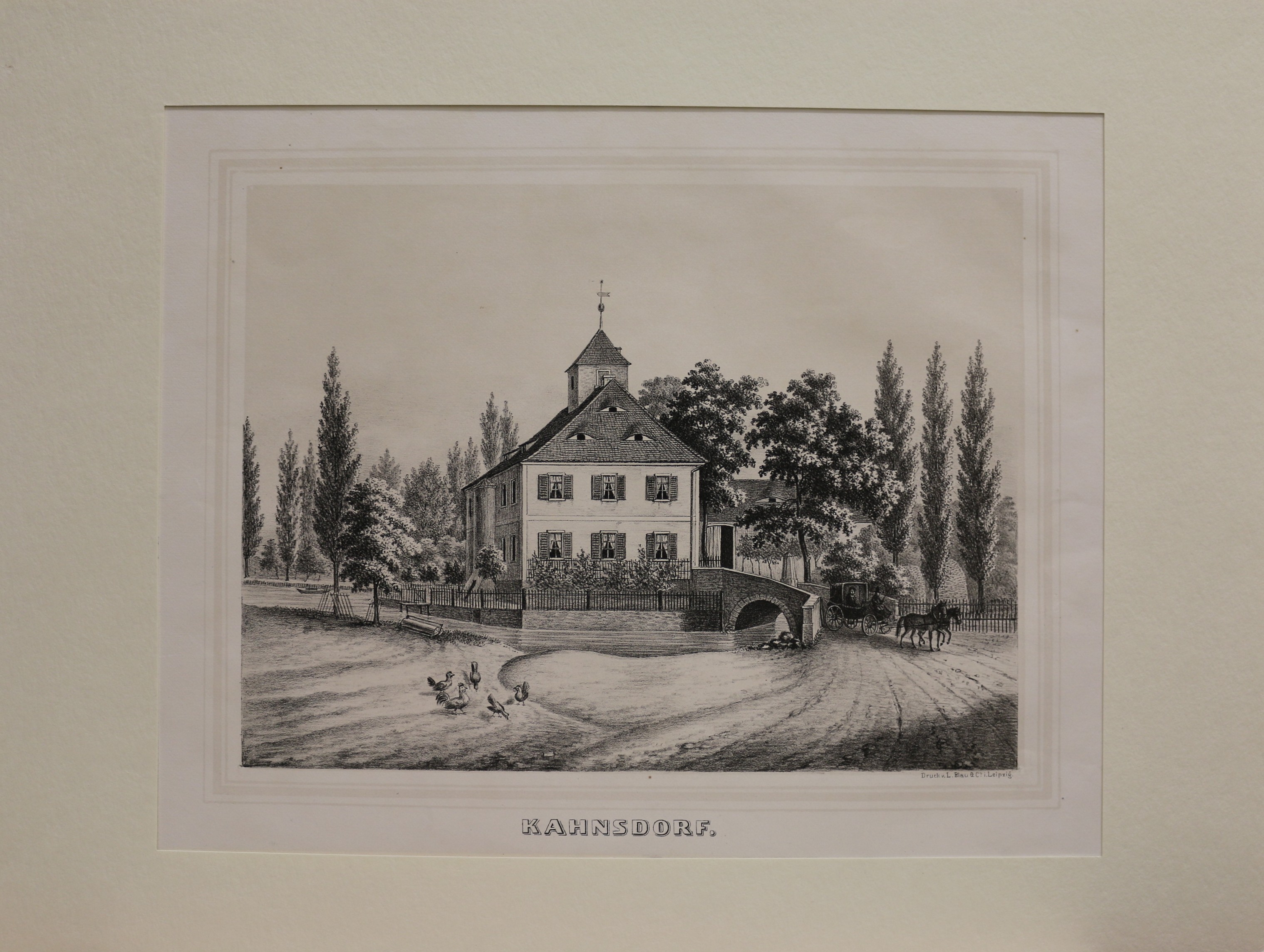 Kahnsdorf: Kahnsdorf. Getönte Lithographie von Blau bei Poenicke, um 1860. 20,2 x 26,4 cm. mit Bordüre. Passepartout: 30 x 40 cm. Gut erhalten.