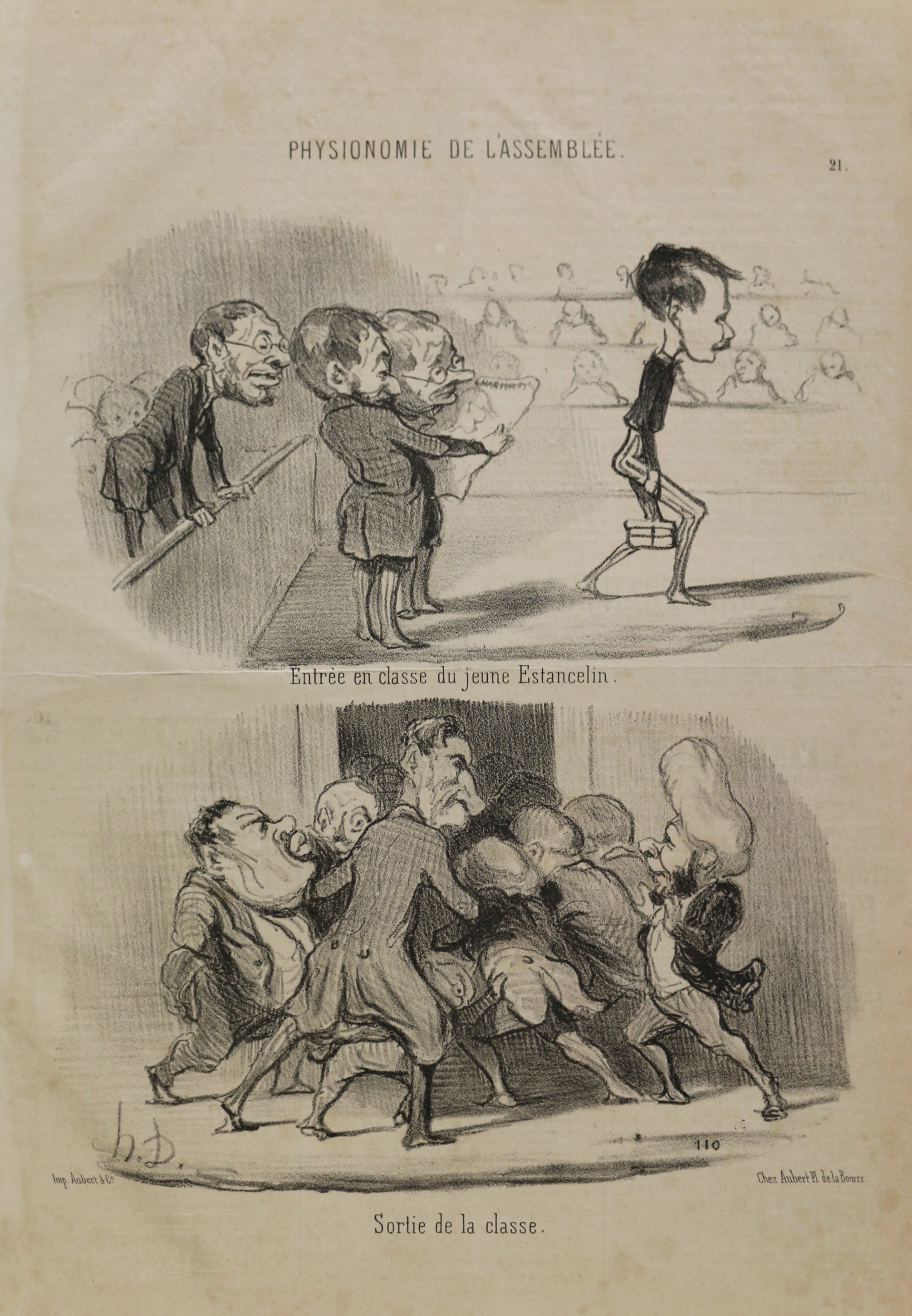 Daumier: Karikatur: Politik: Daumier Honore. PHYSIONOMIES DE L’ASSEMBLÉE (Parade der Abgeordneten) Entrée en classe du jeune Estancelin. Sortie de la classe. Lithographie von Honoré Daumier, aus „Le Charivari“, erschienen am 29.04.1850. Blattformat: 35,5 x 24,4 cm. Gebrauchter Zustand. Stein Nummer 110.