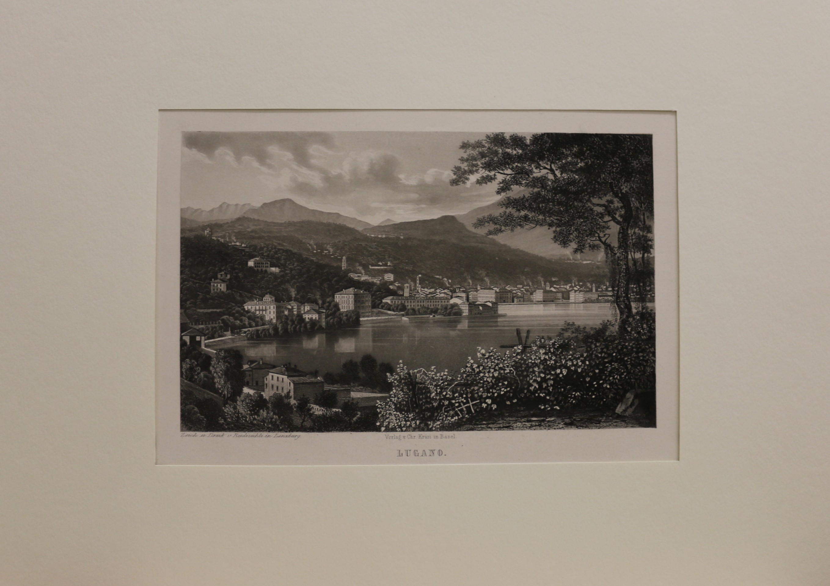 Lugano: Lugano. Aquatinta von Rüdisühli, 1867 bei Chr. Krüsi in Basel erschienen. 13 x 21 cm. Passepartout: 30 x 40 cm. Prima erhalten. Gesamtansicht Lugano am Luganer-See in der Schweiz mit einem schönen Blick auf den See.