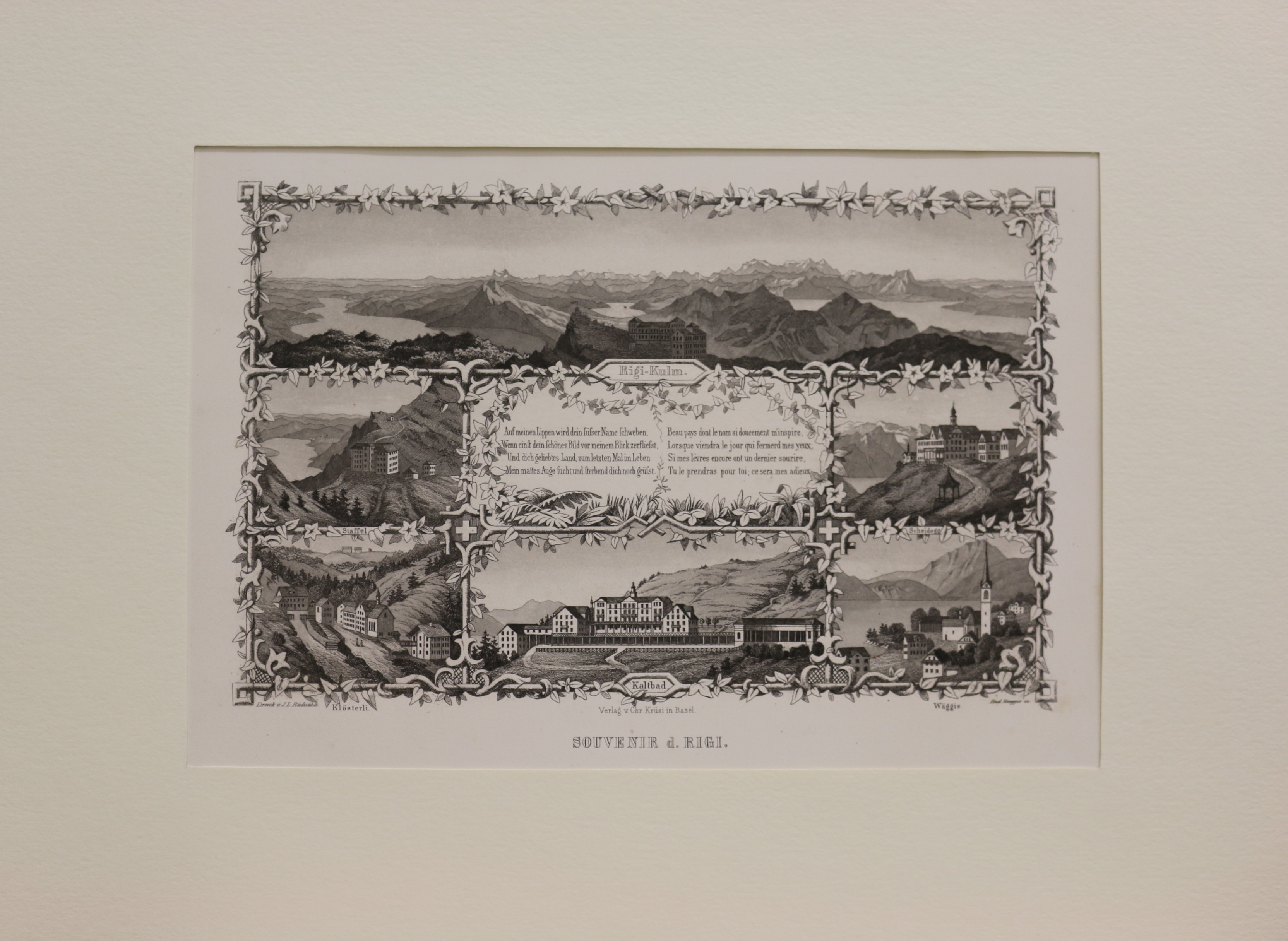 Rigi: Schweiz: Souvenier d. Rigi. Stahlstich von Ringger nach Rüdisühli, 1867 bei Chr. Krüsi in Basel erschienen. 14 x 22 cm. Passepartout: 30 x 40 cm. Gut erhalten.