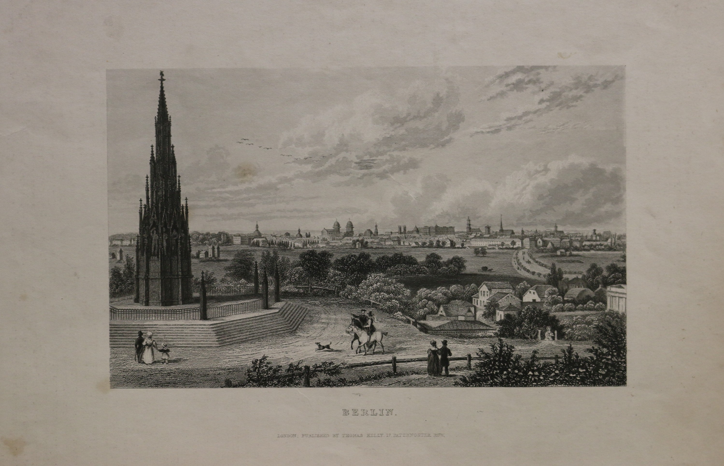 Berlin: Gesamtansicht: vom Kreuzberg aus: Berlin. Stahlstich bei Thomas Kelly in London erschienen, um 1850. 10,5 x 16,9 cm. 2 Stocklecken, sonst gut erhalten. G. Ernst, Bd. 2; Berlin – Gesamtansichten.