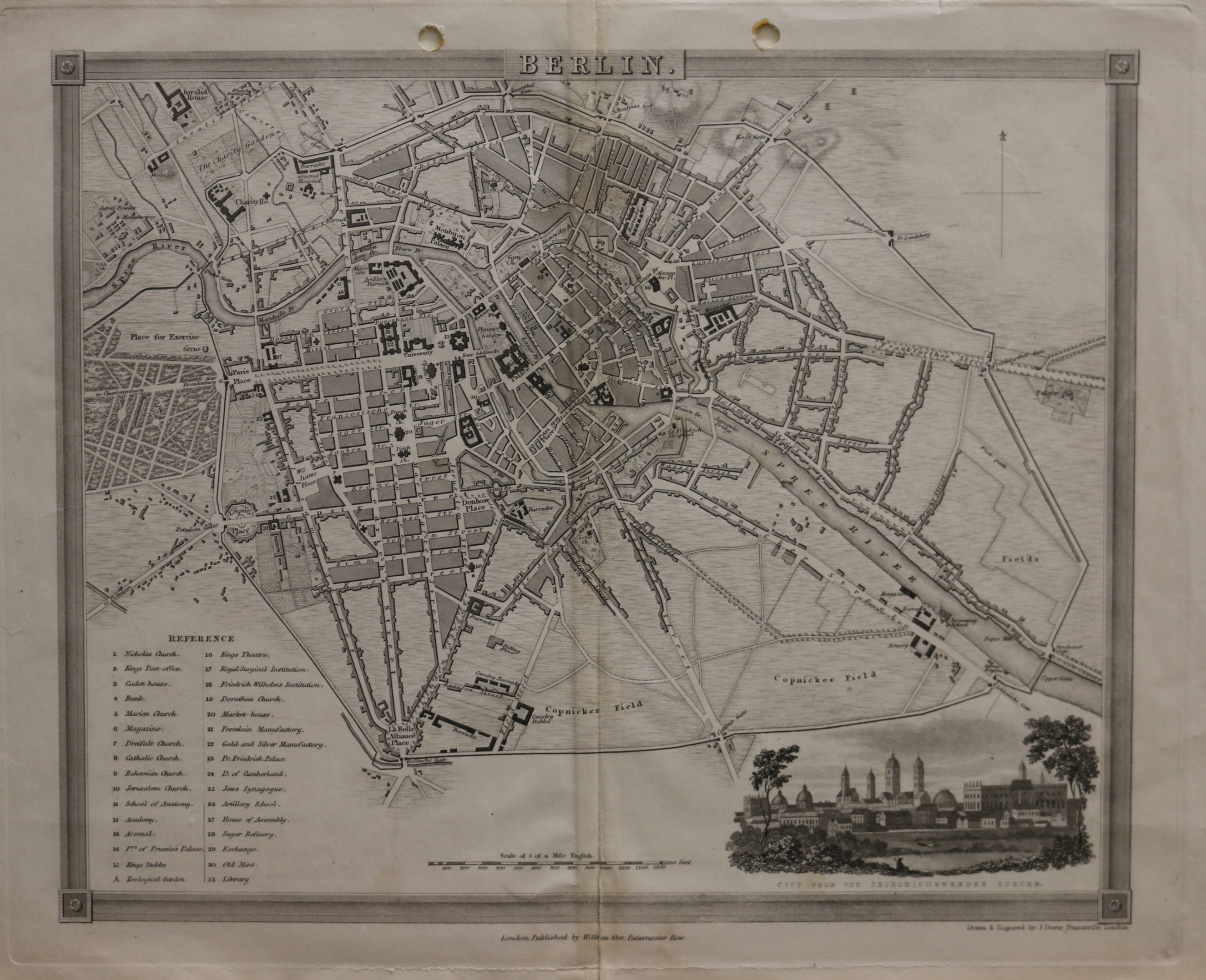 Berlin: Plan: Stadtplan: Berlin. City from the Friedrichswerder Suburb. Stahlstich von Dower bei William Orr in London, um 1826. 21 x 26 cm inkl. Bordüre. Das Blatt wurde leider gelocht, die Mittelfalz ist restauriert. Sonst gut erhalten. Links unten Erklärungen von 1 bis 31. Rechts unten kleine Ansicht von Berlin-Mitte.