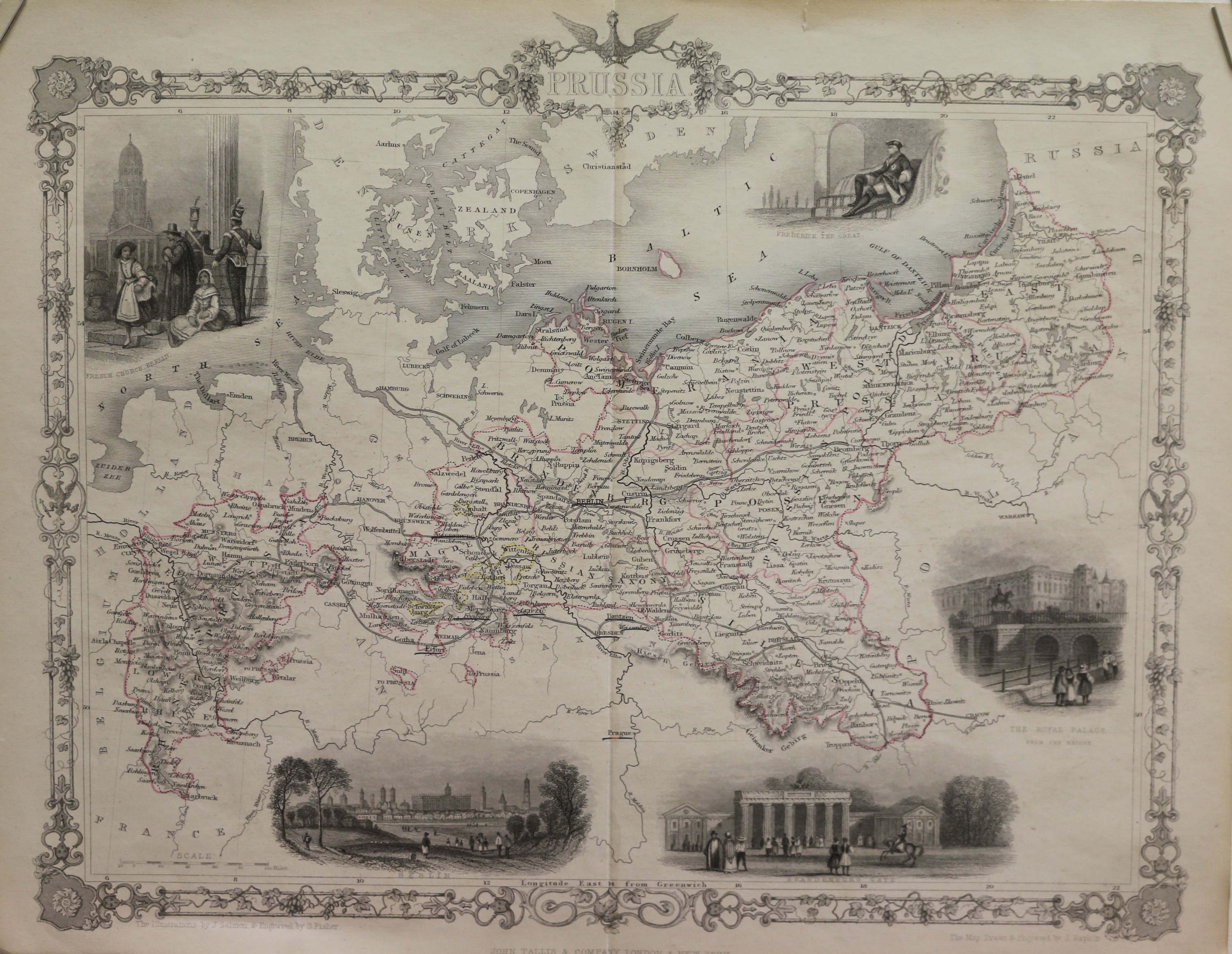 Preussen: Prussia. Stahlstich nach J. Rapkin von S. Fisher, um 1850. 21,8 x 30 cm ohne Bordüre. Gut erhalten. Die Karte umgeben mit 5 Ansichten von Berlin. U.a. Gesamtansicht, Brandenburger Tor, Schloß mit der Kurfürstenbrücke u. franz. Kirche und Friedrich II.