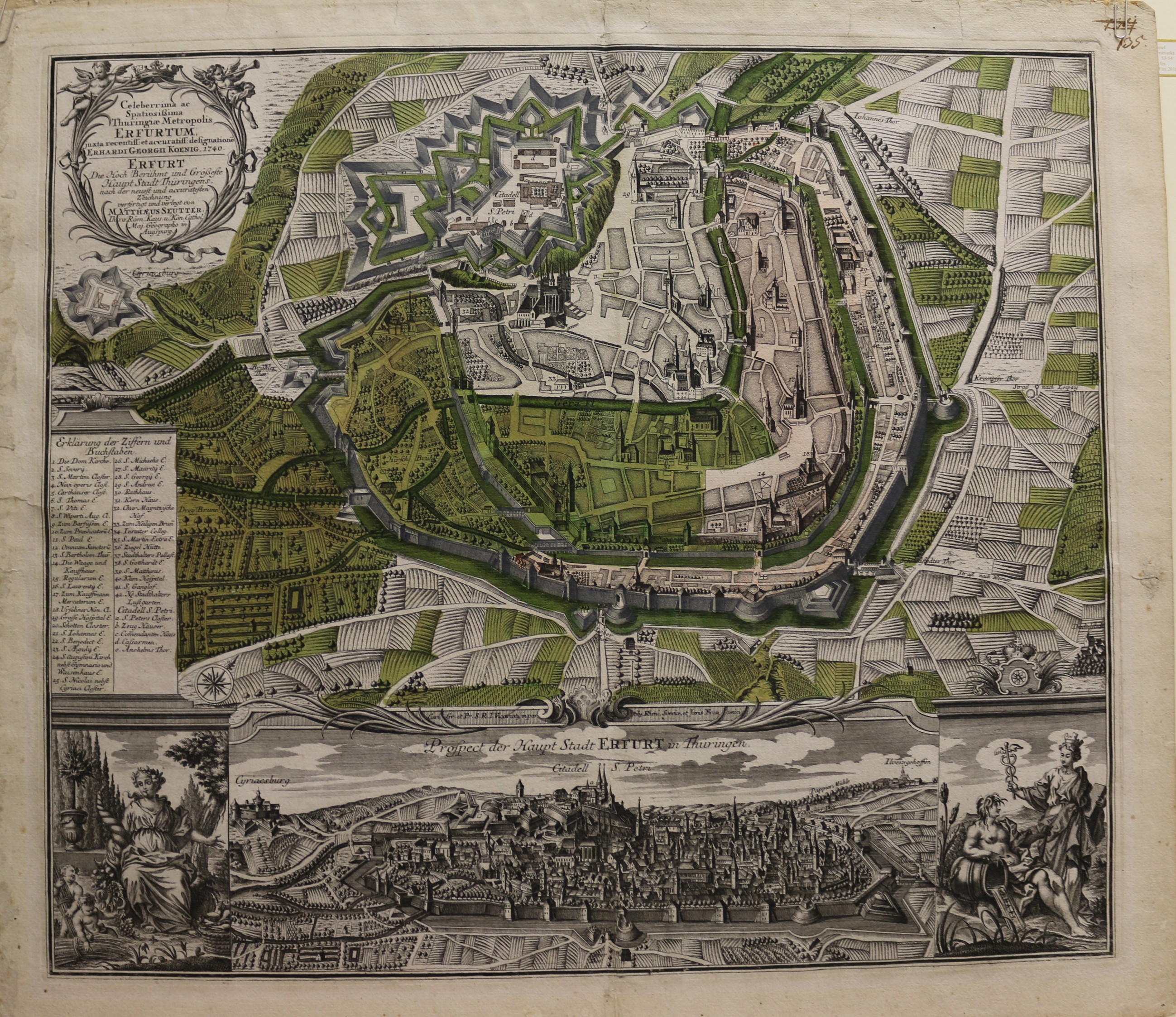 Erfurt: Plan: Gesamtansicht: Seutter. Erfurt die Hoch Berühmt und Größeste Haupt Stadt Thüringens. Celeberrima ac Spatiosißima Thuringiae Metropolis ERFURTUM. altkolorierter Kupferstich, Matthäus Seutter, um 1740. 49 x 56,5 cm. Blattformat: 49 x 64 cm. Einige Einrisse und Stockflecken an den Rändern, sonst gut erhalten. Schöner Plan & Gesamtansicht von Erfurt, oben links die Titelkartusche, darunter Erklärungen.