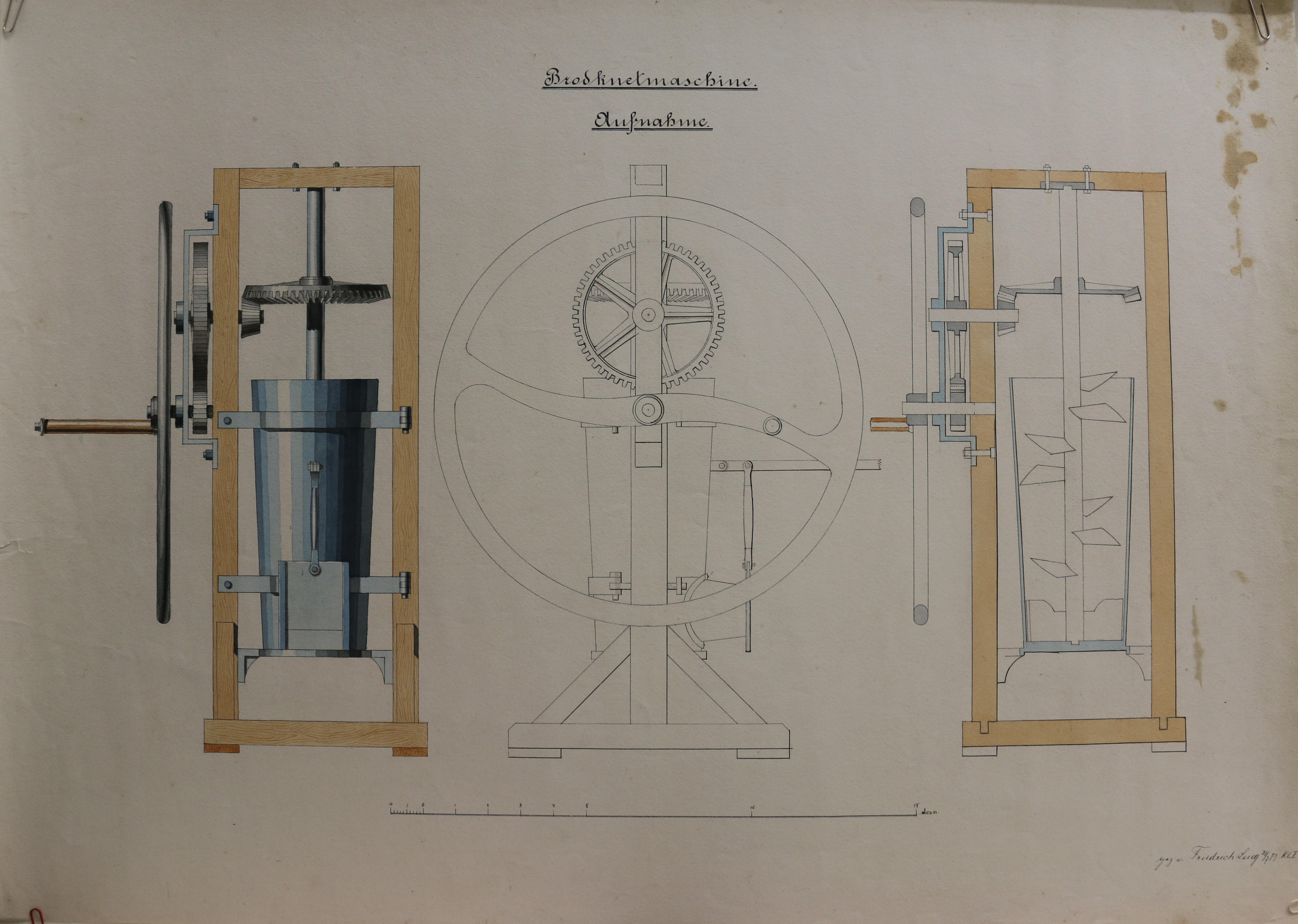 Brotknetmaschine: Brodknetmaschine Aufnahme. Federzeichnung oder Federlitho von Friedrich Lueg, 1879. Blattformat: 48,7 x 69 cm. Rechts im Bild fleckig, links kleiner Einriß, sonst gut erhalten.