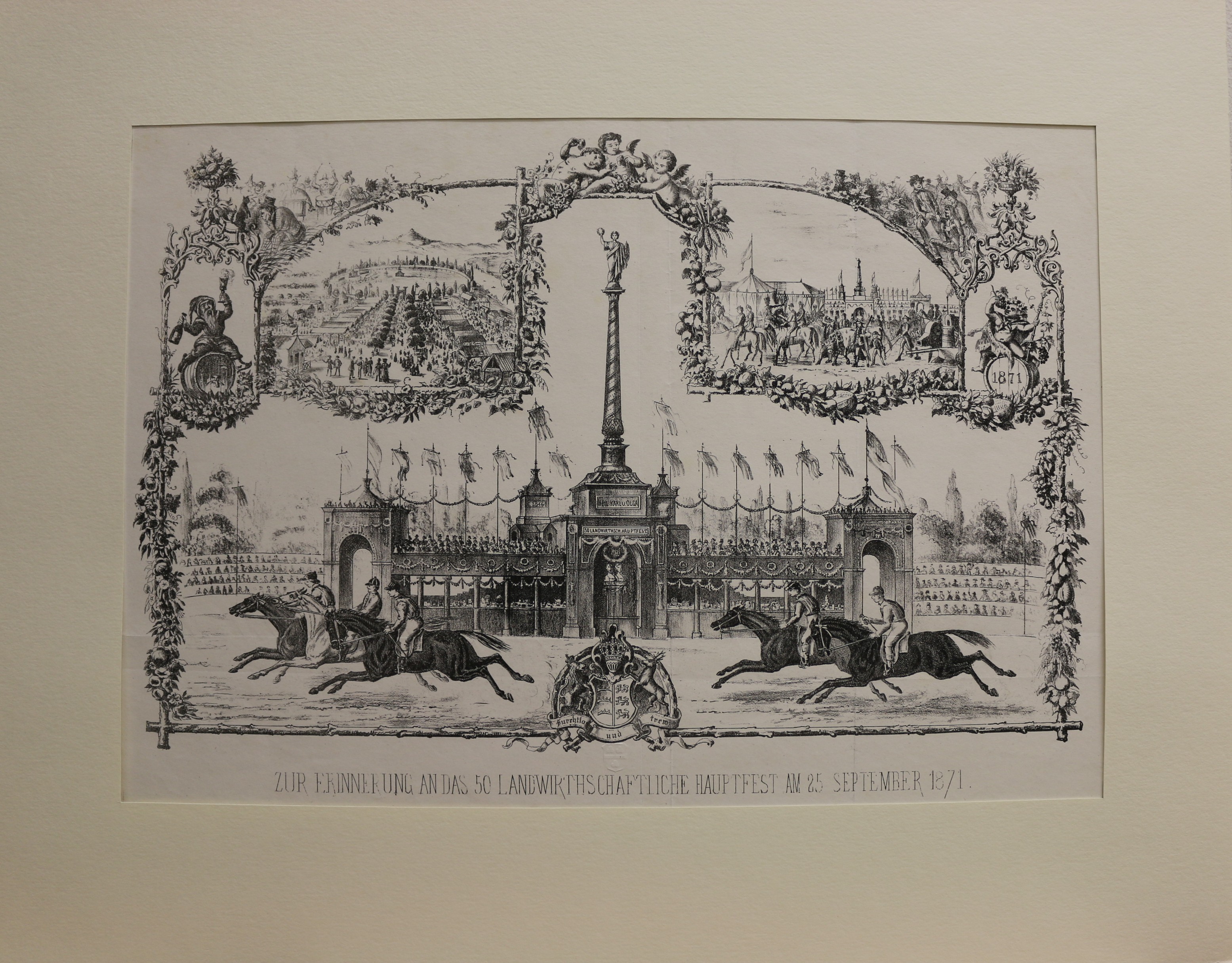 Stuttgart: Landwirtschaft: Zur Erinnerung an das 50 Landwirtschaftliche Hauptfest am 25 September 1871. Lithografie bei L. Rachel in Stuttgart erschienen, 1872. 26 x 41 cm. Passepartout: 40 x 50 cm. Gut erhalten.
