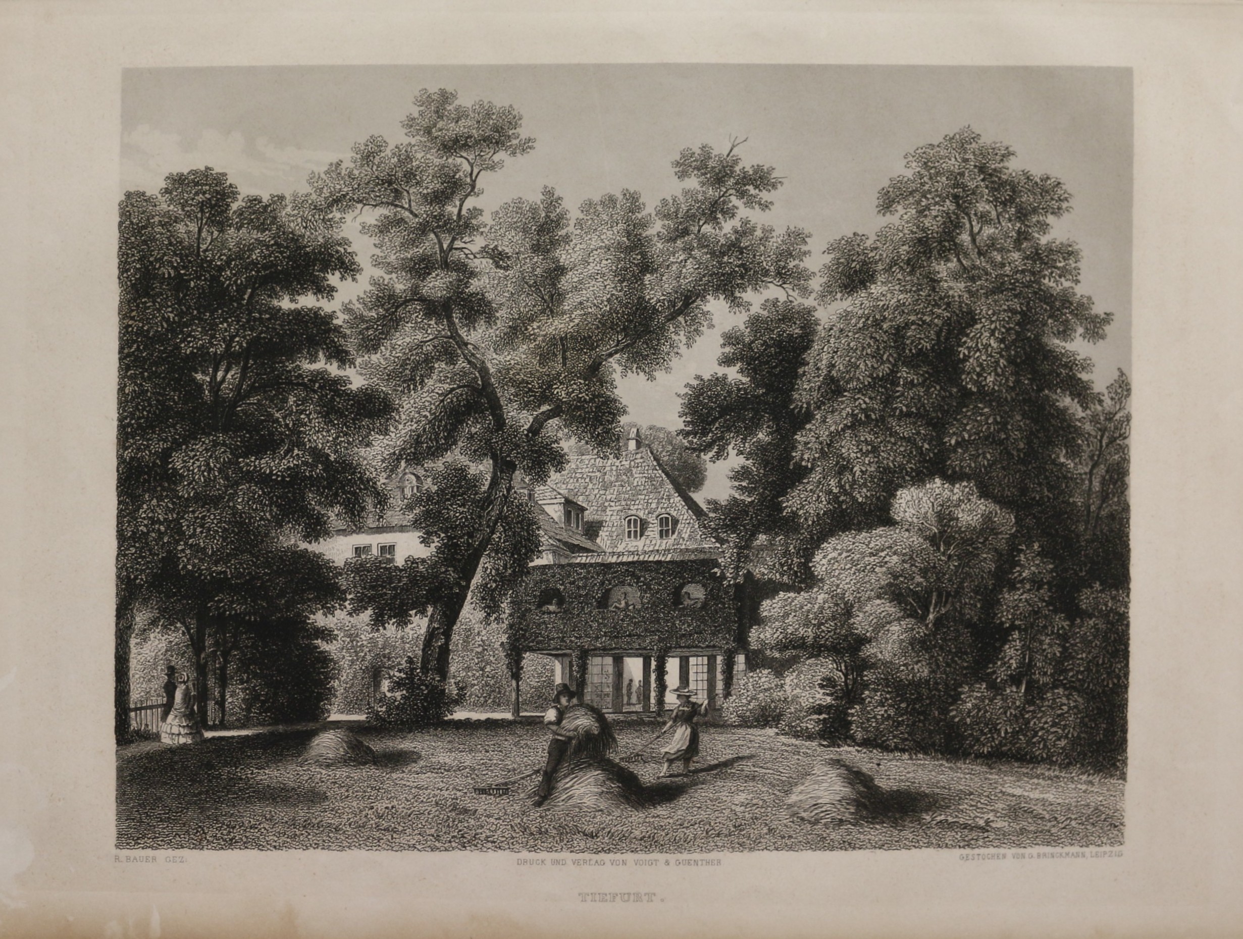 Tiefurt. Stahlstich von Gustav Brinckmann nach R. Bauer, 1860 bei Voigt & Guenther erschienen. Blattformat: 24,2 x 34,5 cm. Patina, sonst gut erhalten.
