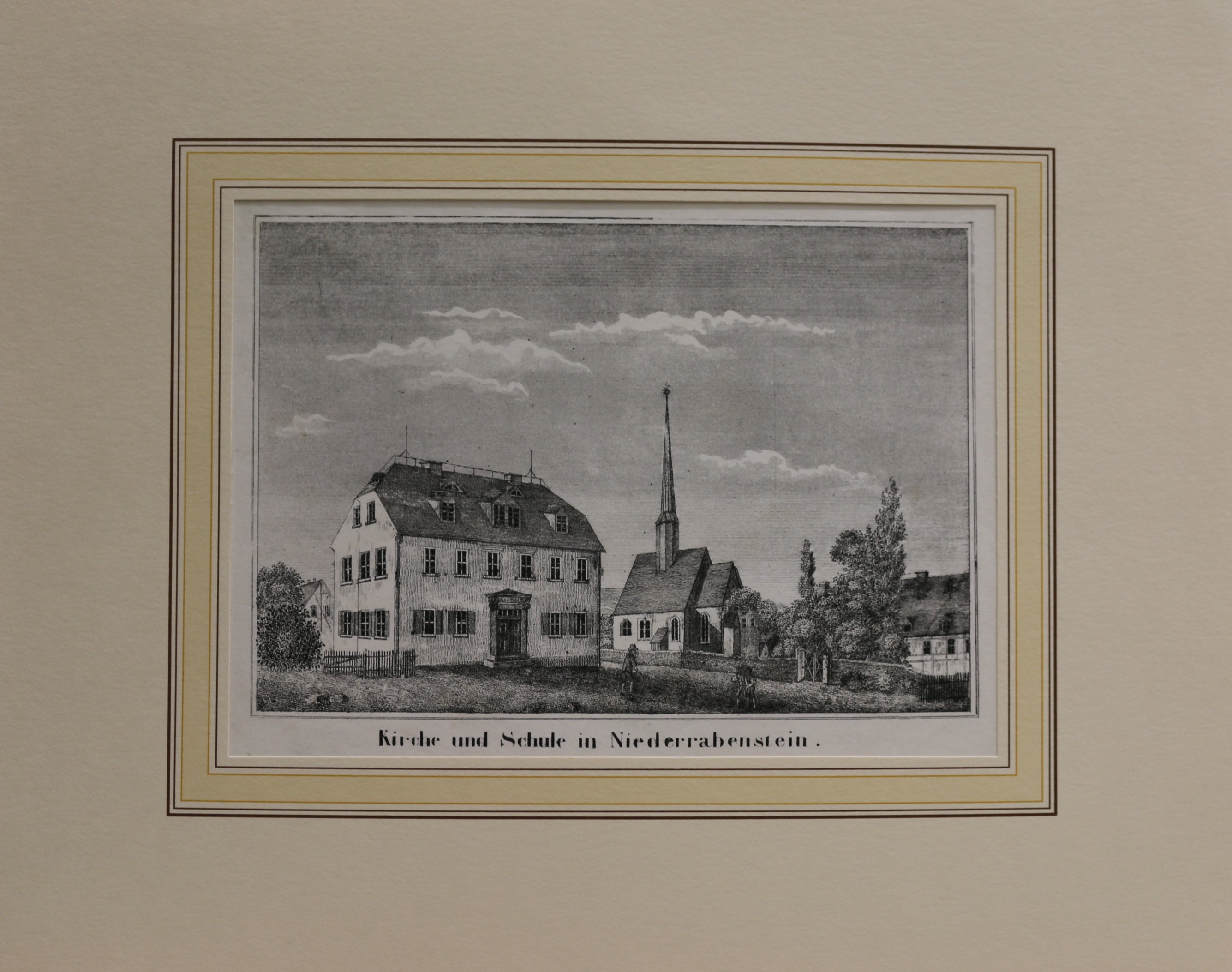 Niederrabenstein: Schule: Kirche: Kirche und Schule in Niederrabenstein. Lithografie um 1844. Auf Chinapapier. Selten. 11,5 x 17 cm. Passepartout: 24 x 30 cm. Gut erhalten.