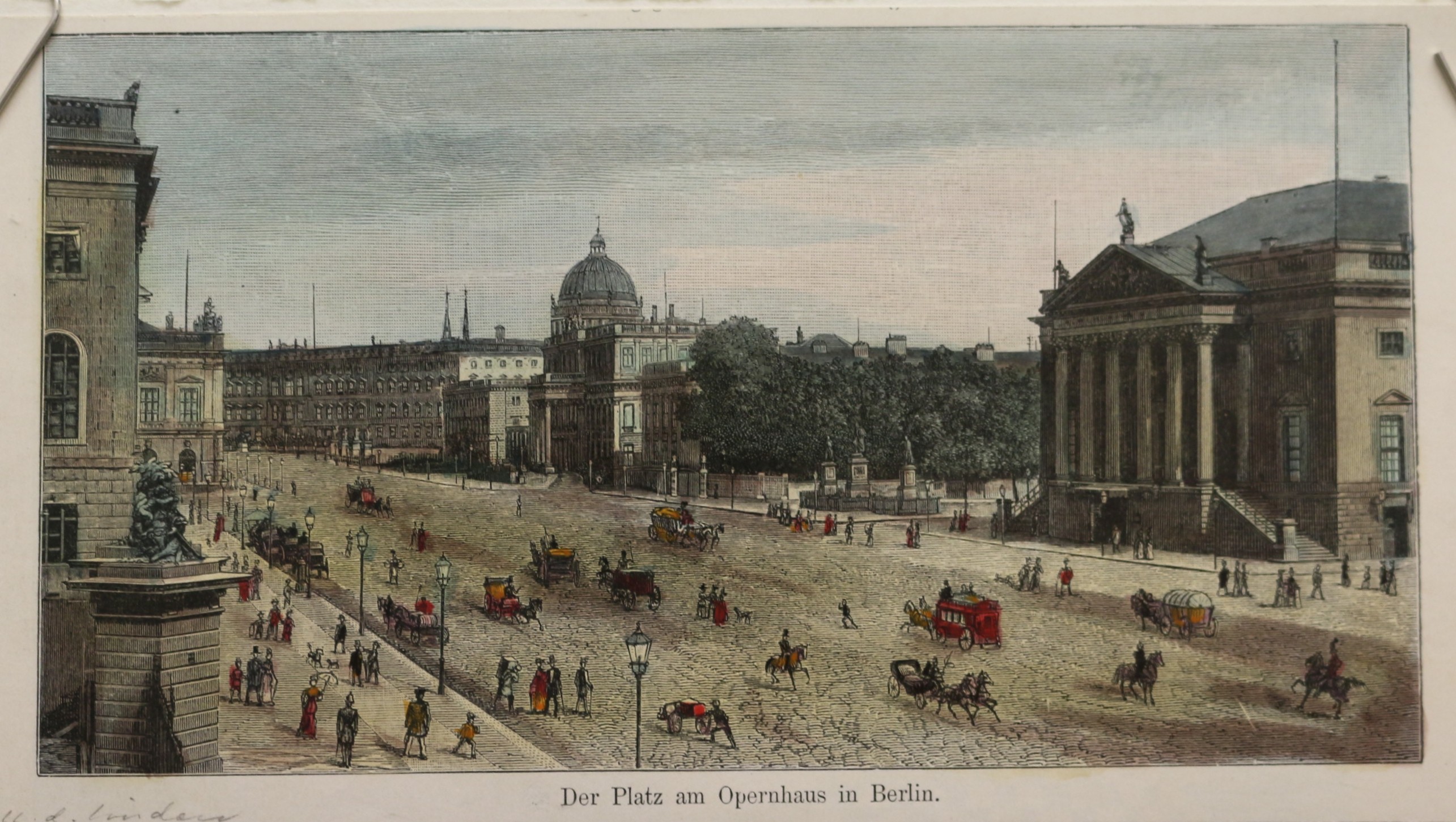 Berlin: Oper: Unter den Linden: Der Platz am Opernhaus in Berlin. Kolorierter Holzstich, um 1870. 9 x 16,7 cm. Gut erhalten.