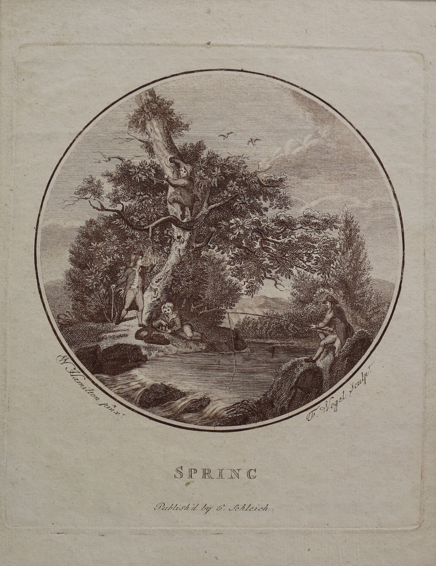 Spring: Frühling: Jahreszeiten: Spring. Radierung von Vogel nach W. Hamilton bei G. Schleich, um 1800. Seltenes Blatt. 13,5 x 14 cm im Rund. Passepartout: 26 x 35 cm. Gut erhalten.
