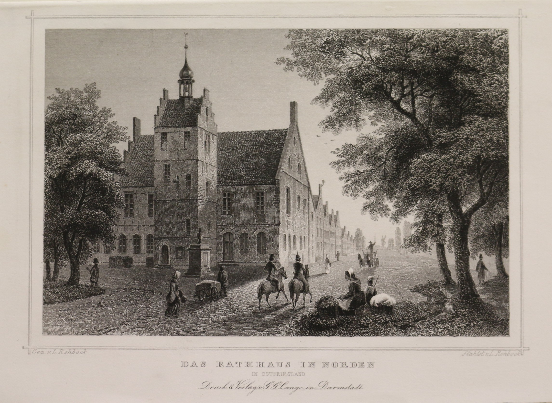 Norden: Rathaus: Das Rathaus in Norden, in Ostfriesland. Stahlstich von und nach Ludwig Rohbock, 1858 bei Gustav Lange in Darmstadt erschienen. 12,4 x 18,3 cm. Gut erhalten.