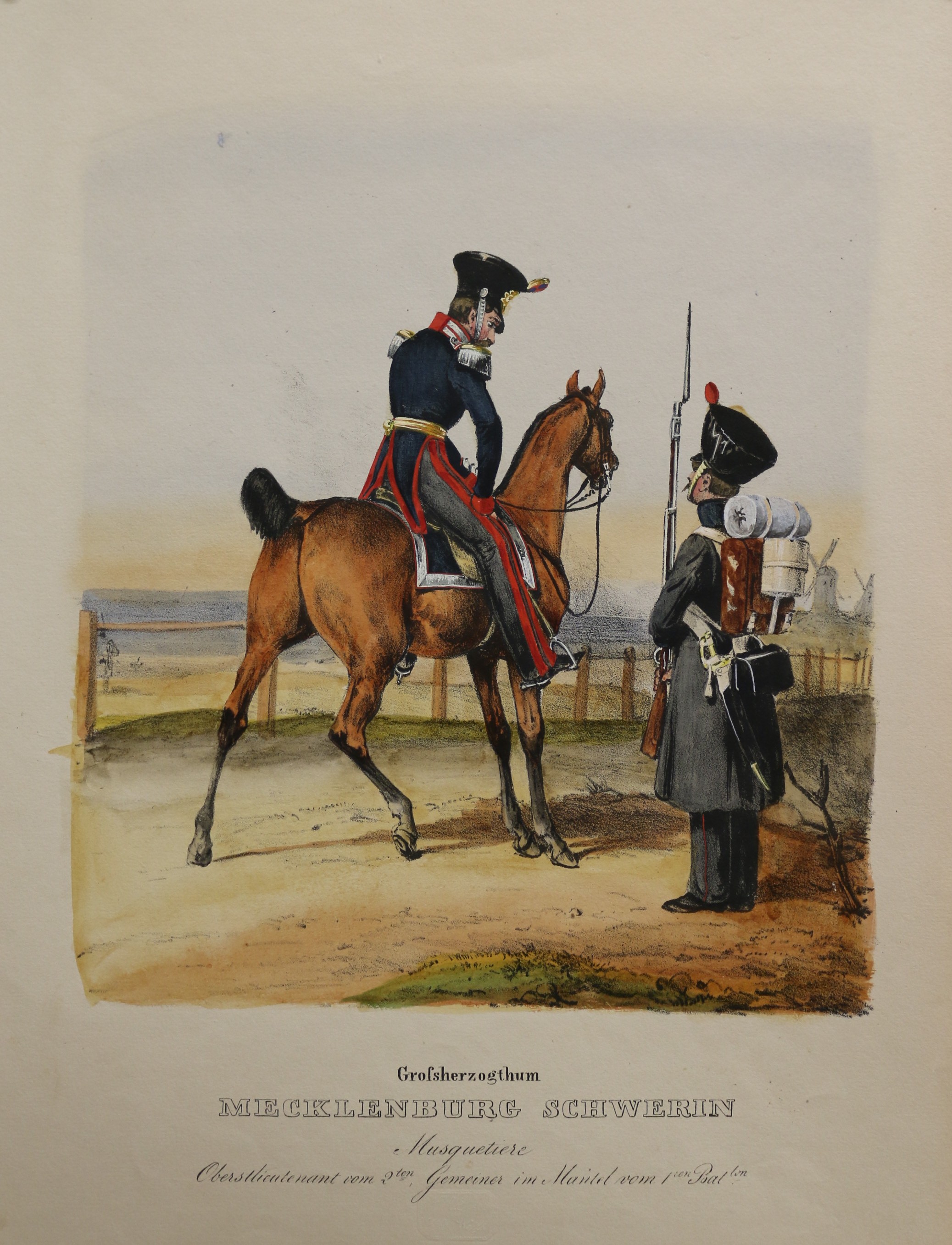 Uniformen: Eckert: Das deutsche Bundesheer: Großherzogthum Mecklenburg Schwerin Musquetiere. altkolorierte Lithographie, bei H. A. Eckert & Christian Weiß in München erschienen, 1838. Das deutsche Bundesheer in charakteristischen Gruppen. 24 x 21 cm. Blattformat: 36,5 x 25,5 cm. Gut erhalten.