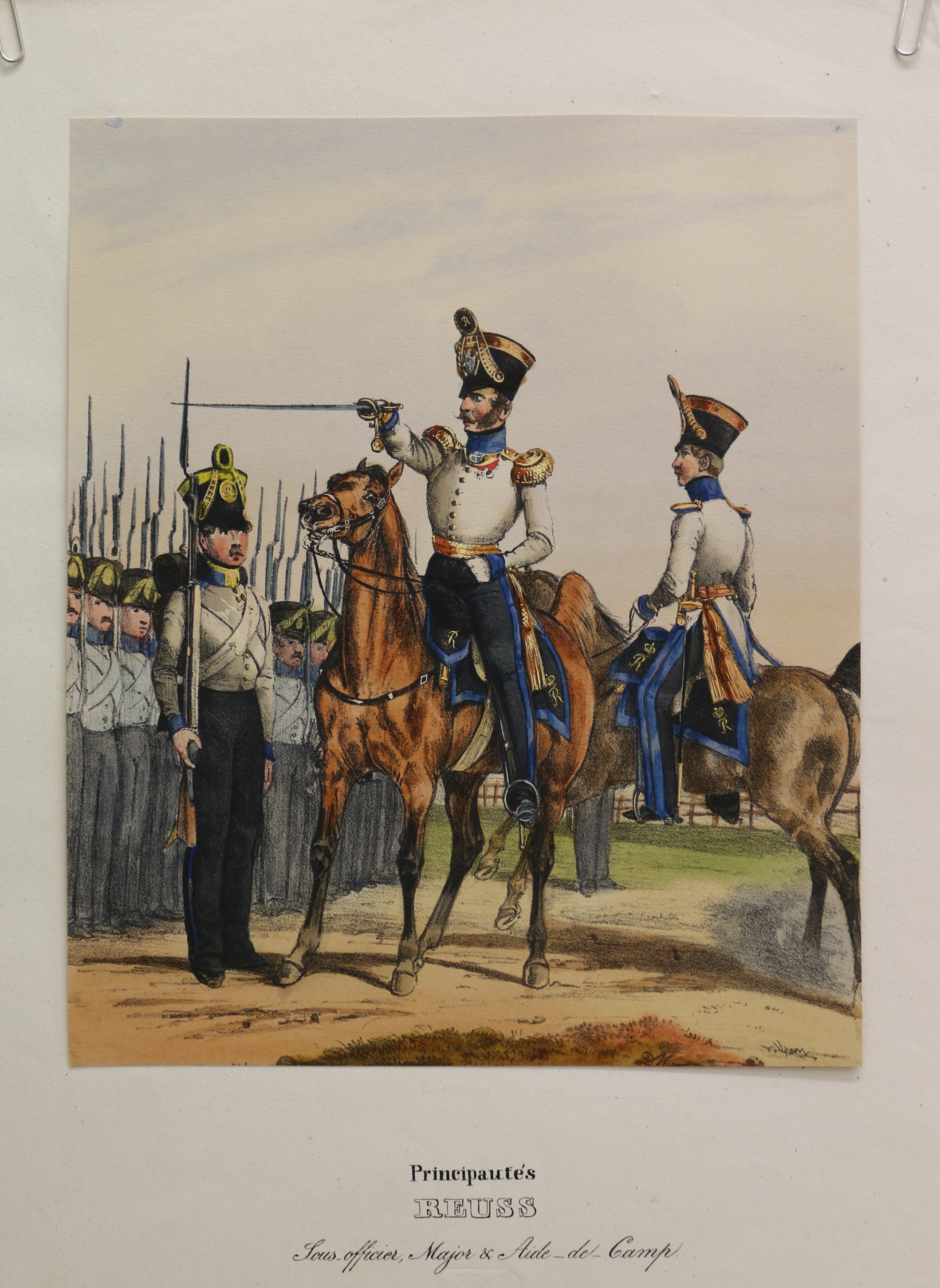 Uniformen: Eckert: Das deutsche Bundesheer: Principautés Reuss. altkolorierte Lithographie, bei H. A. Eckert & Christian Weiß in München erschienen, 1838. Das deutsche Bundesheer in charakteristischen Gruppen. 24,7 x 20,6 cm. Blattformat: 36,2 x 25 cm. Gut erhalten.