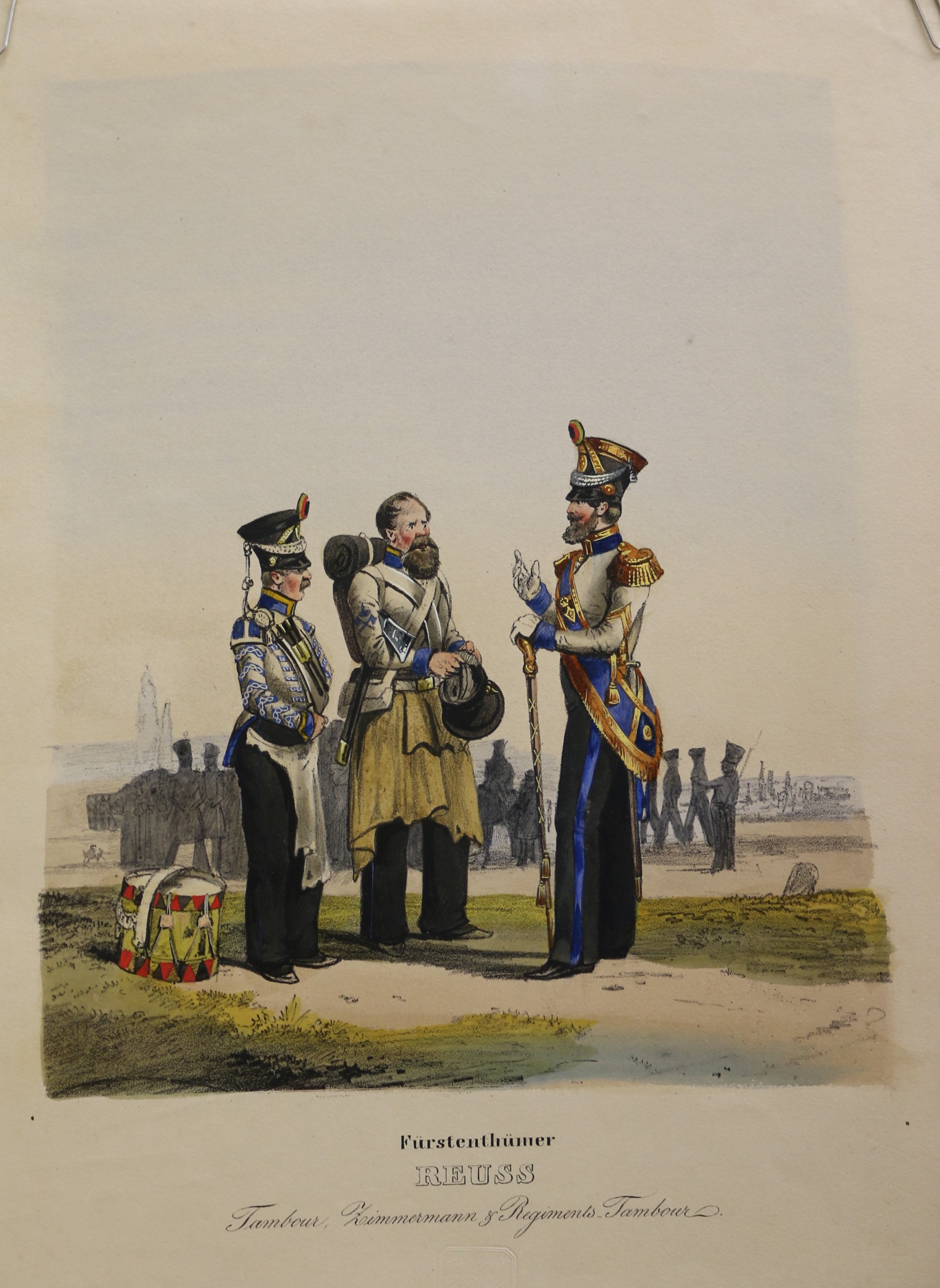 Uniformen: Eckert: Das deutsche Bundesheer: Fürstenthümer Reuss Tambour, Zimmermann & Regiments Tambour. altkolorierte Lithographie, bei H. A. Eckert & Christian Weiß in München erschienen, 1838. Das deutsche Bundesheer in charakteristischen Gruppen. 27,7 x 22,5 cm. Blattformat: 36,2 x 25 cm. Gut erhalten.