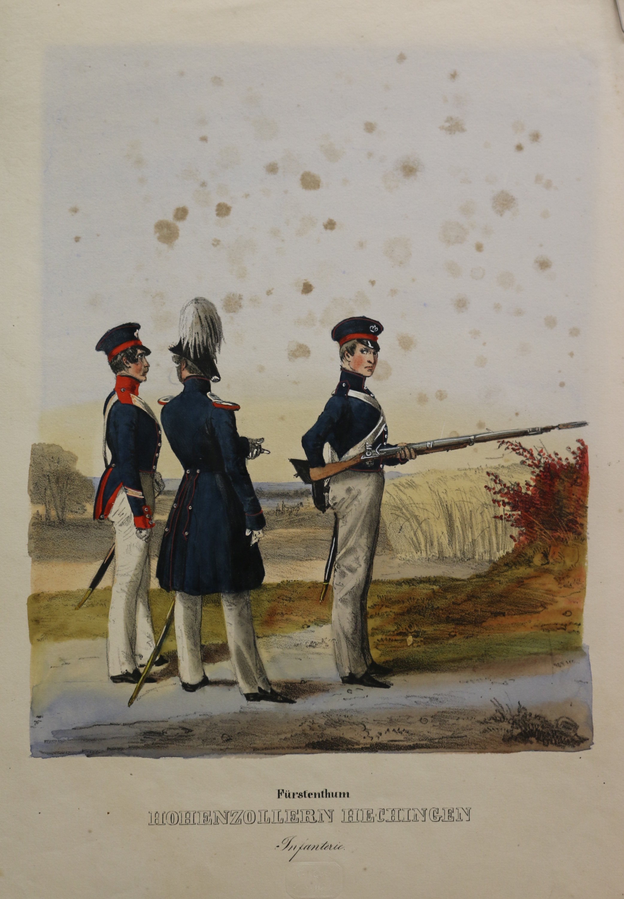Uniformen: Eckert: Das deutsche Bundesheer: Fürstenthum Hohenzollern Hechingen Infanterie. altkolorierte Lithographie bei H.A. Eckert & Christian Weiß in München erschienen, 1838. Das deutsche Bundesheer in charakteristischen Gruppen. 26,7 x 21 cm. Blattformat: 37 x 25,2 cm. Stark fleckig.