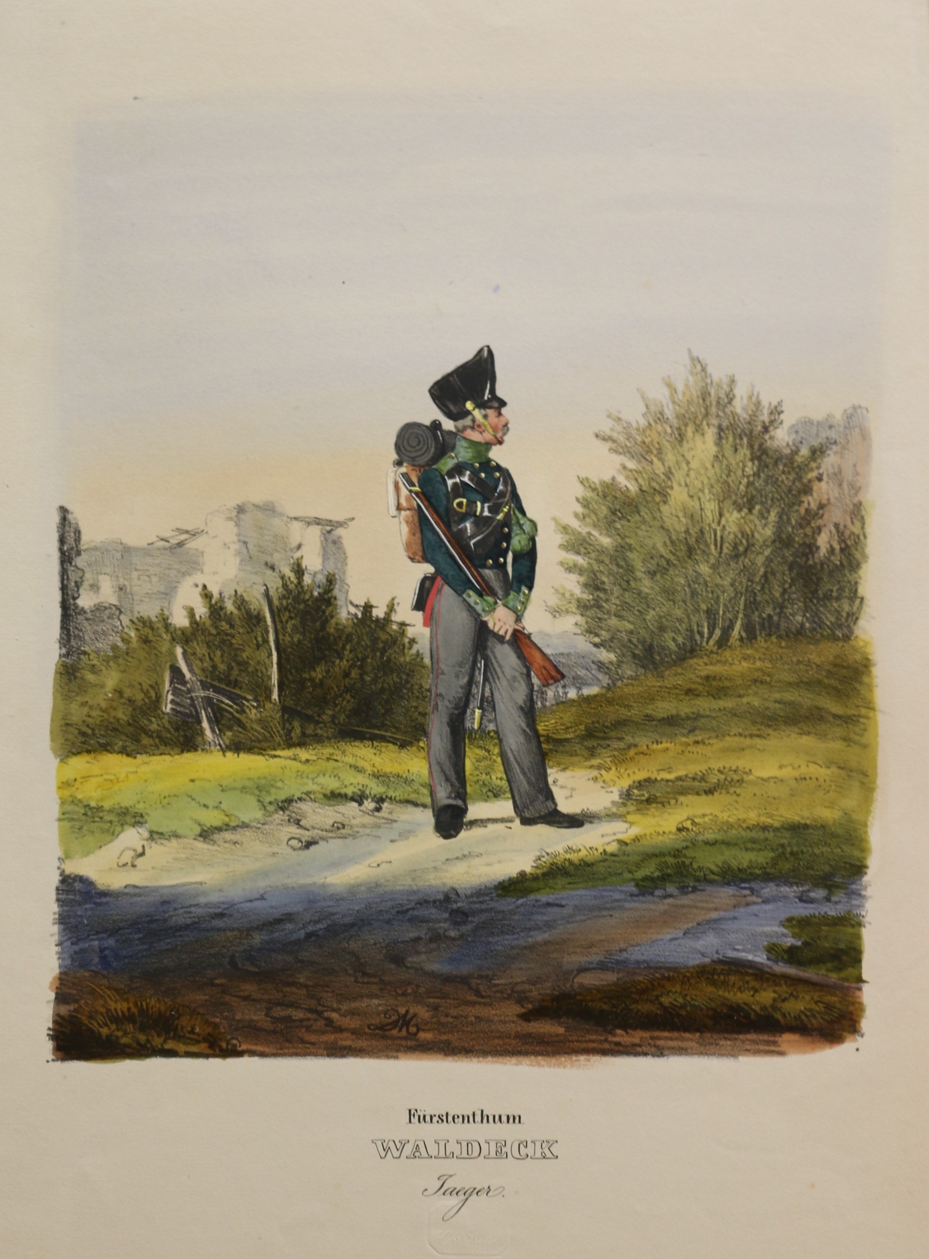 Uniformen: Eckert: Das deutsche Bundesheer: Fürstenthum Waldeck Jäger. altkolorierte Lithographie bei H.A. Eckert & Christian Weiß in München erschienen, 1838. Das deutsche Bundesheer in charakteristischen Gruppen. 25,4 x 21 cm. Blattformat: 37 x 25,2 cm. Gut erhalten.