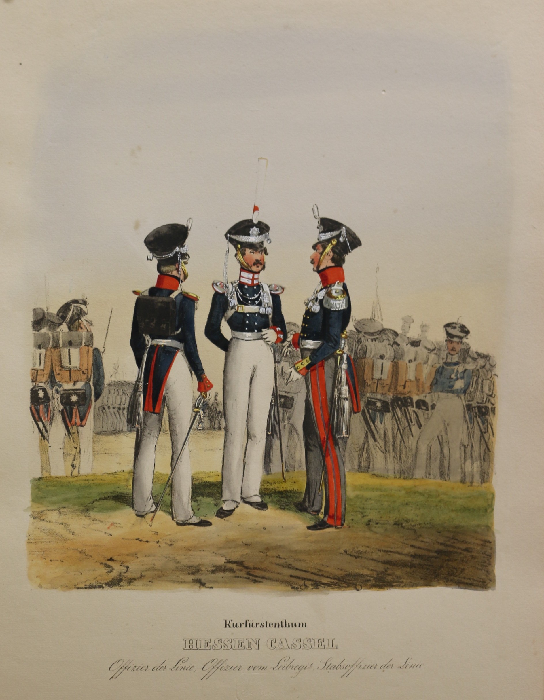 Uniformen: Eckert: Das deutsche Bundesheer: Kurfürstenthum Hessen Kassel Offizier der Linie … altkolorierte Lithographie, bei H. A. Eckert & Christian Weiß in München erschienen, um 1840. Das deutsche Bundesheer in charakteristischen Gruppen. 26 x 21 cm. Blattformat: 37 x 25,2 cm. Gut erhalten.