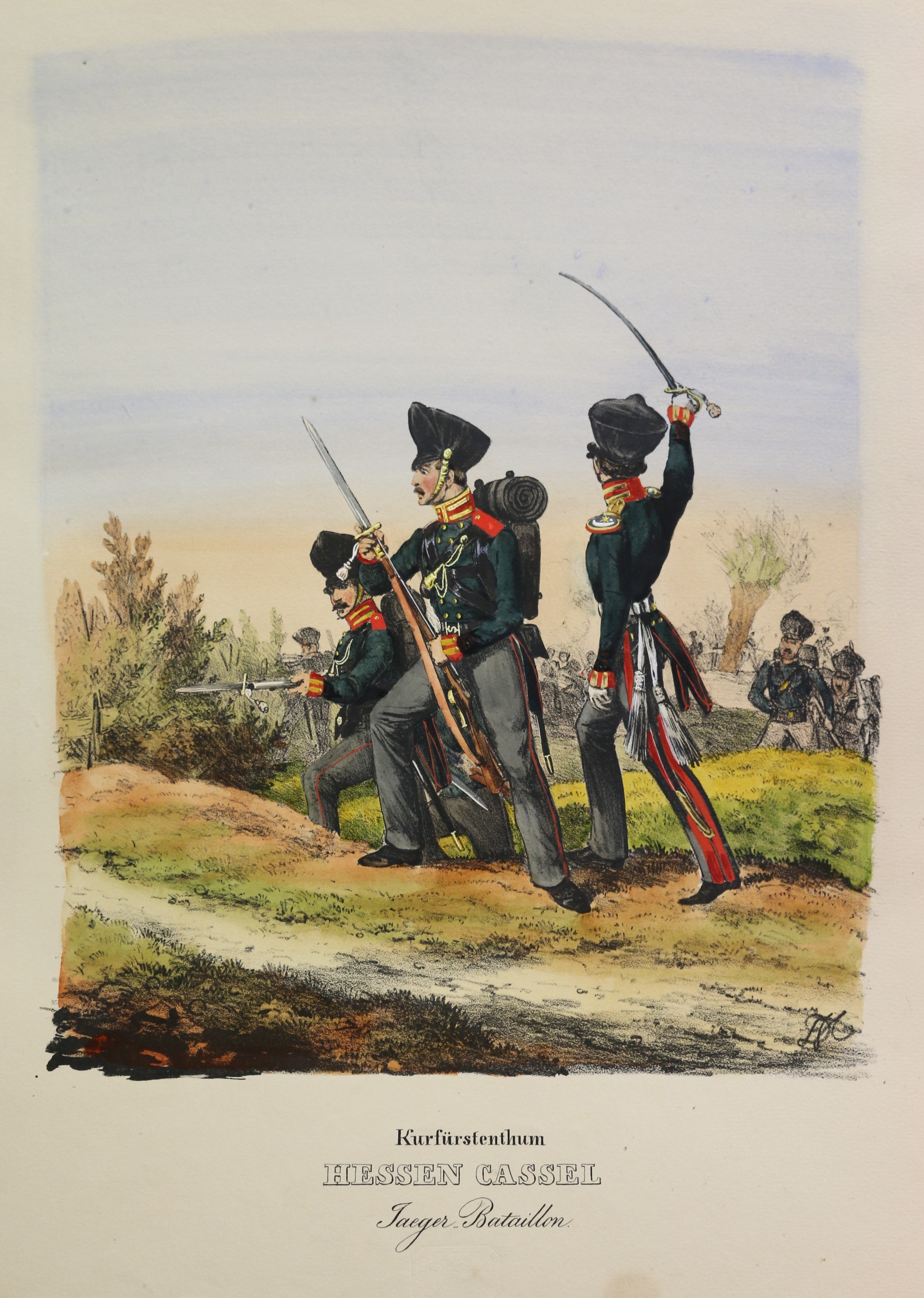 Uniformen: Eckert: Das deutsche Bundesheer: Kurfürstenthum Hessen Cassel Jaeger Bataillon. altkolorierte Lithographie, bei H. A. Eckert & Christian Weiß in München erschienen, um 1840. Das deutsche Bundesheer in charakteristischen Gruppen. 26,2 x 21 cm. Blattformat: 37 x 25,2 cm. Unten 2 Fettflecken, sonst gut erhalten.