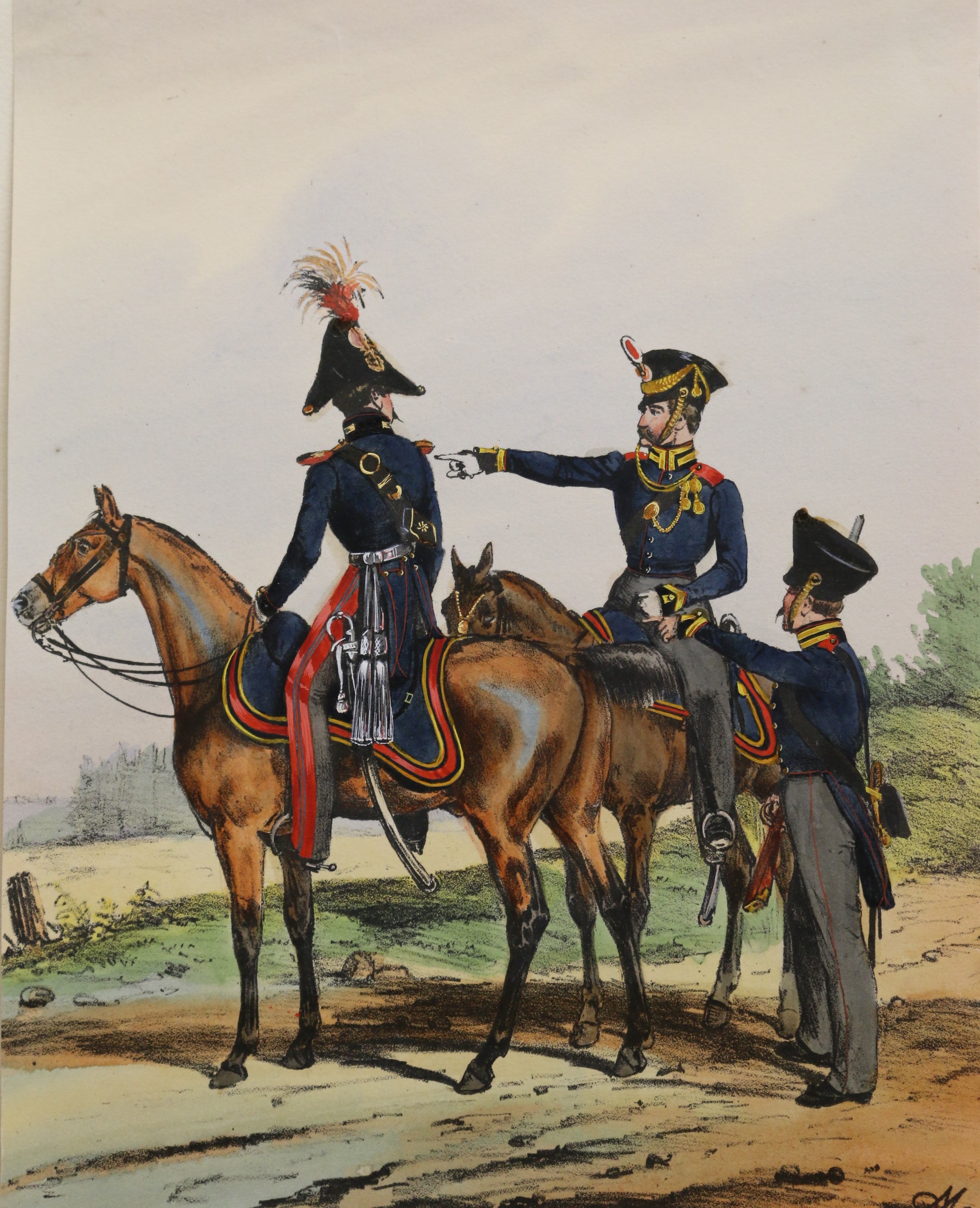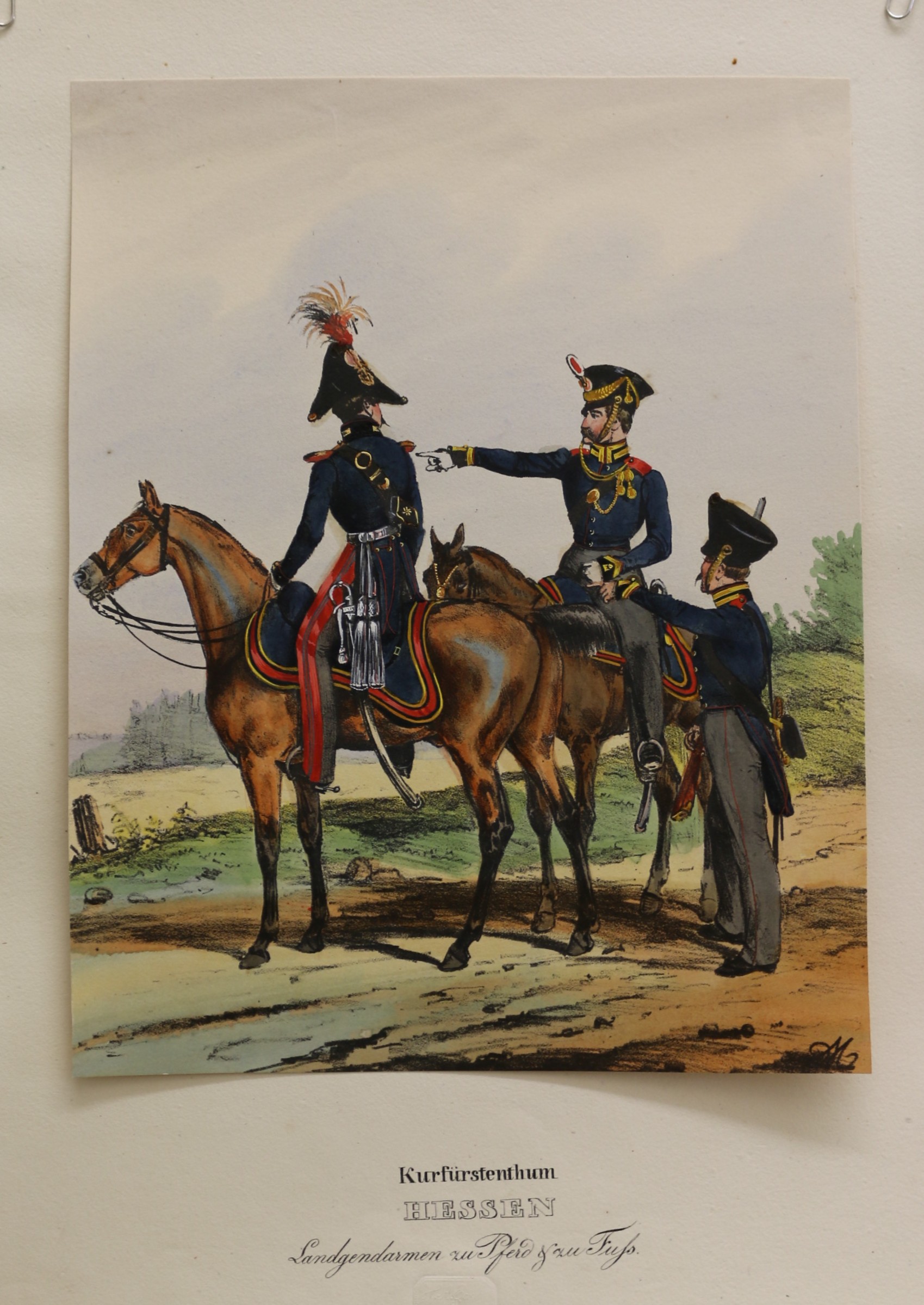 Uniformen: Eckert: Das deutsche Bundesheer: Kurfürstenthum Hessen, Landgendarmen zu Pferd und zu Fuß. altkolorierte Lithographie, bei H. A. Eckert & Christian Weiß in München erschienen, um 1840. Das deutsche Bundesheer in charakteristischen Gruppen. 25,7 x 20,3 cm. Blattformat: 37 x 25,2 cm. Gut erhalten.
