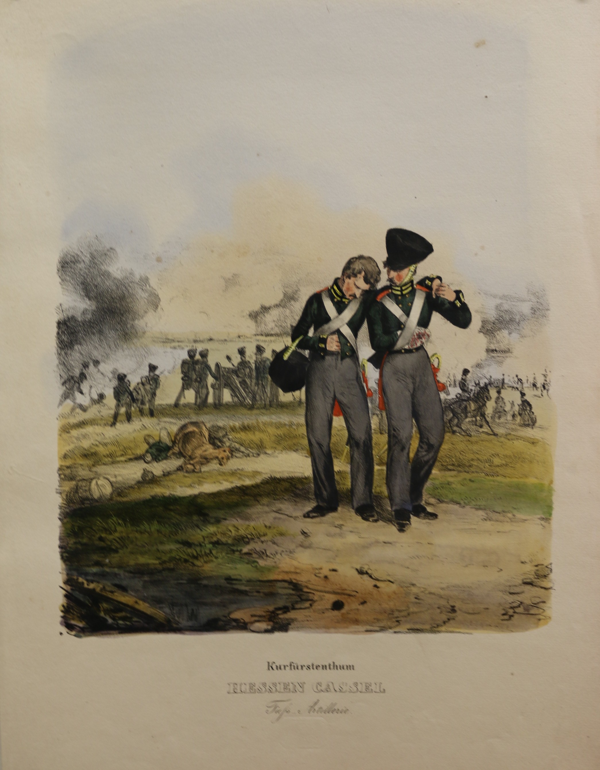 Uniformen: Eckert: Das deutsche Bundesheer: Kurfürstenthum Hessen Cassel Fuß-Artillerie. altkolorierte Lithographie, bei H. A. Eckert & Christian Weiß in München erschienen, um 1840. Das deutsche Bundesheer in charakteristischen Gruppen. 27,2 x 21 cm. Blattformat: 37 x 25,2 cm. Gut erhalten.