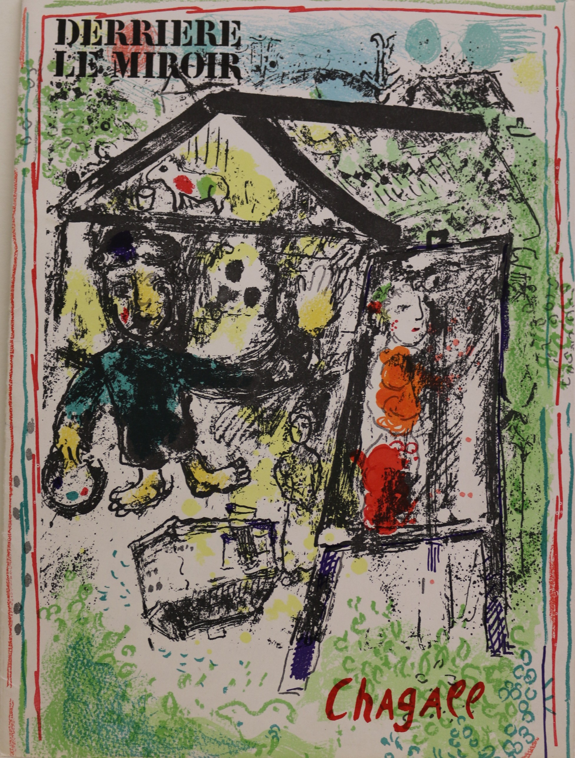 Chagall: Derriere le miroir 182: Hinter dem Spiegel: Träumerei: Derriere le miroir. No. 182. Reverie und Behind the Mirror. 38 x 28,2 cm. Prima erhalten. Cramer Nr. 81. Mourlot Nr. 603 a. & 605. Mit 2 Original-Farblithografien von Marc Chagall gedruckt bei Mourlot in Paris, 1969. Erschienen bei Maeght in einer Auflage von 5.000 Exemplaren. Colour lithograph by Marc Chagall printed by Mourlot in Paris, 1969, published by Maeght in an edition of 5,000 copies. 32 Seiten Lose, vollständig mit vielen Abbildungen. Lithos: Umschlag- Hinter dem Spiegel. Doppelblatt- Träumerei.