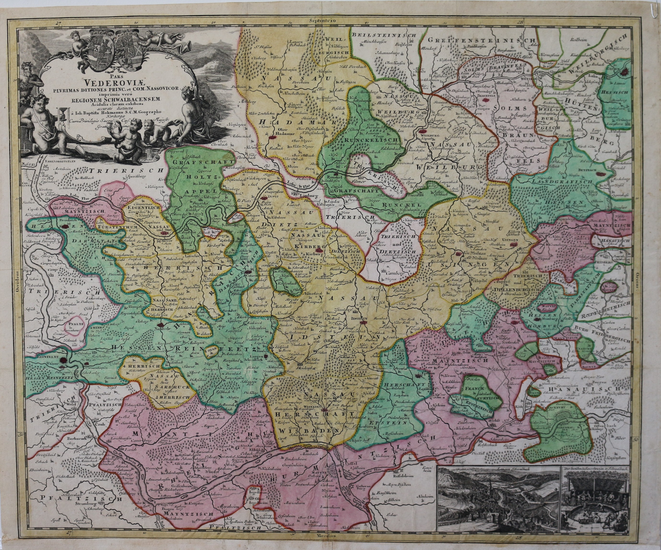 Taunus: Nassau: Bad Schwalbach: Landkarte: Pars Vederoviae Plurimas Ditiones Princ. et Com. Nassovicor. imprimis vero Regionem Schwalbacensem … Kolorierter Kupferstich bei Johann Baptist Homann, mit Druckprivileg, erschienen nach 1729. 46,7 x 56 cm. Blattformat: 49 x 60 cm. Unten angerändert sonst gut erhalten. Unten rechts 2 kleine Ansichten von Bad Schwalbach und dem Sauerbrunnen.