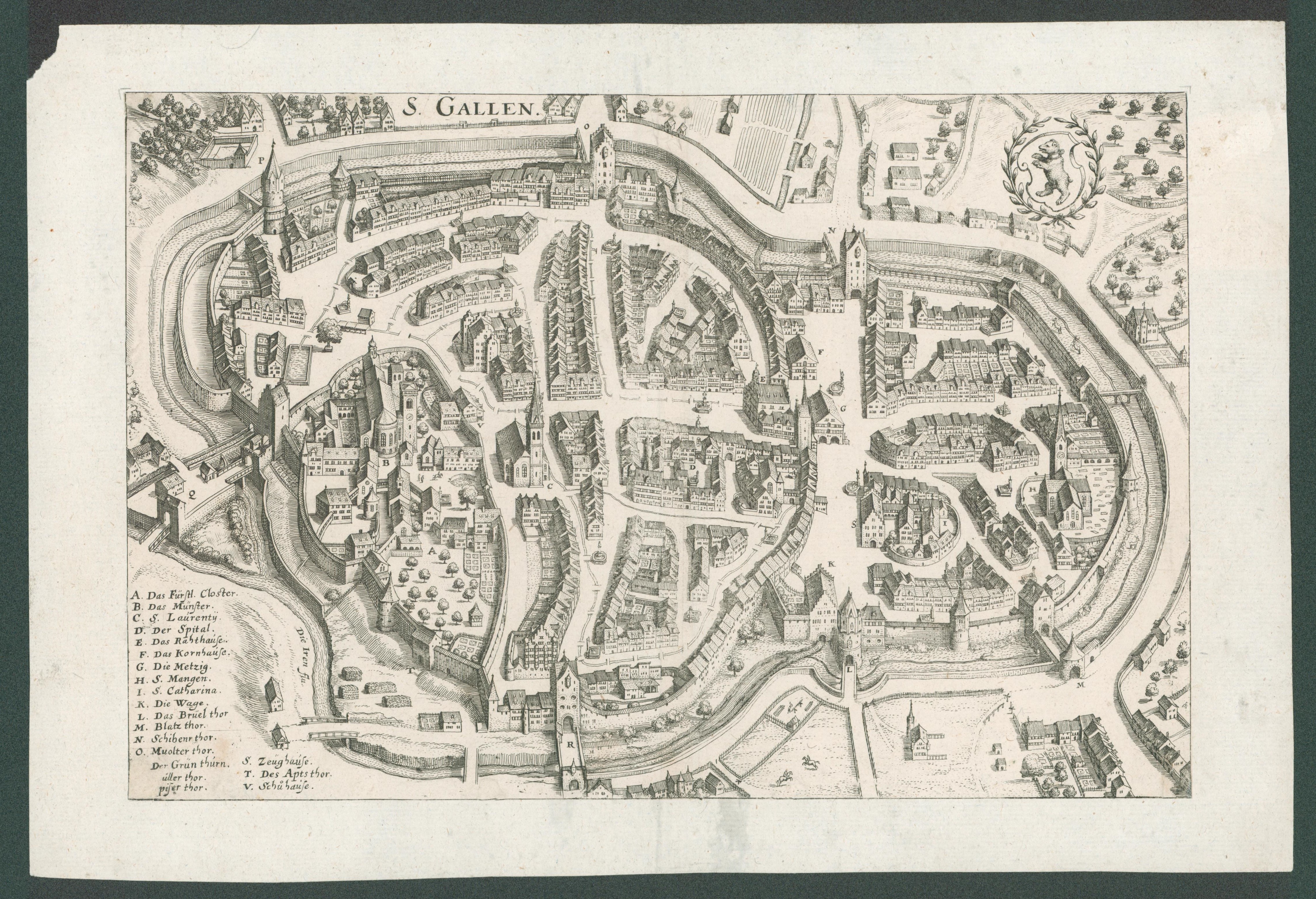 Schweiz: St. Gallen: Gesamtansicht: S. Gallen. Kst. von Matthäus Merian der Ältere, 1734 20,5 x 31 cm. Auf altem Papier aufgezogen, oben links kleiner Abriss, sonst prima erhalten. Unten links Legende A bis V.