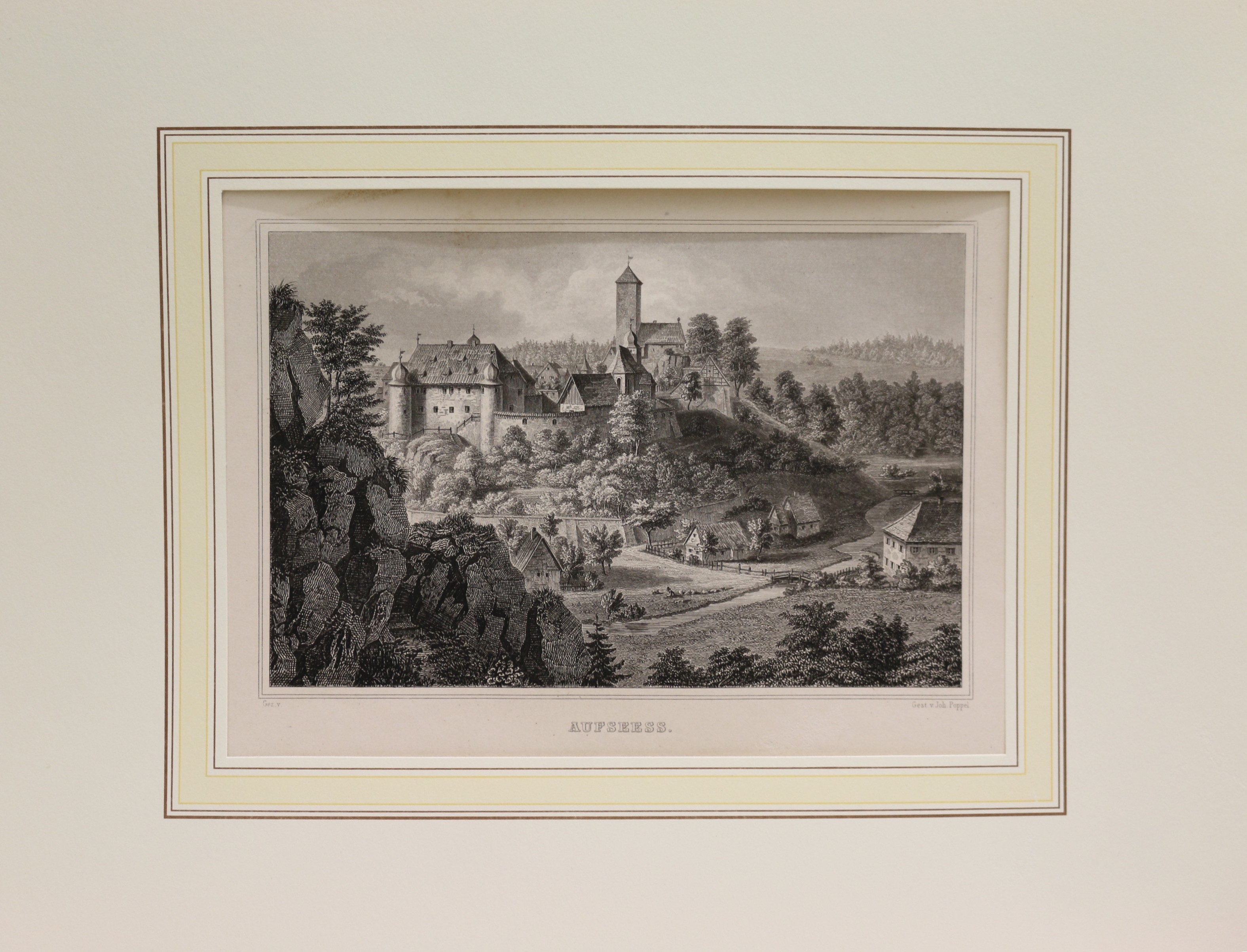 Aufseß: Bayern: Aufseess. Stahlstich von Poppel, 1879. 10,5 x 16cm. Passepartout: 24 x 30 cm. Oben brauner Abklatsch und 1 Stockfleck auf der Rückseite, sonst gut erhalten.
