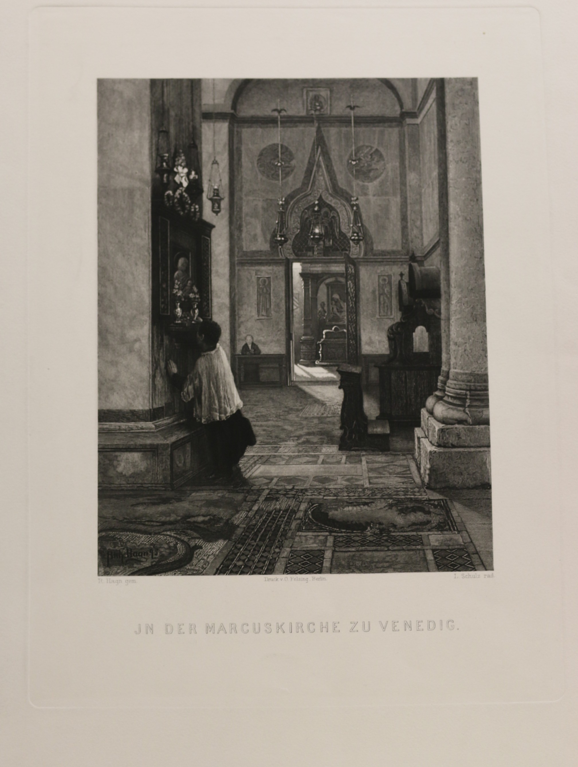 Venedig: Markuskirche: In der Marcuskirche zu Venedig. Radierung von Schulz nach Richard von Hagn, 1895 auf Kupferdruckkarton bei Otto Felsing in Berlin erschienen. 24,7 x 19 cm. Blattformat: 46,2 x 36,2 cm. Gut erhalten.
