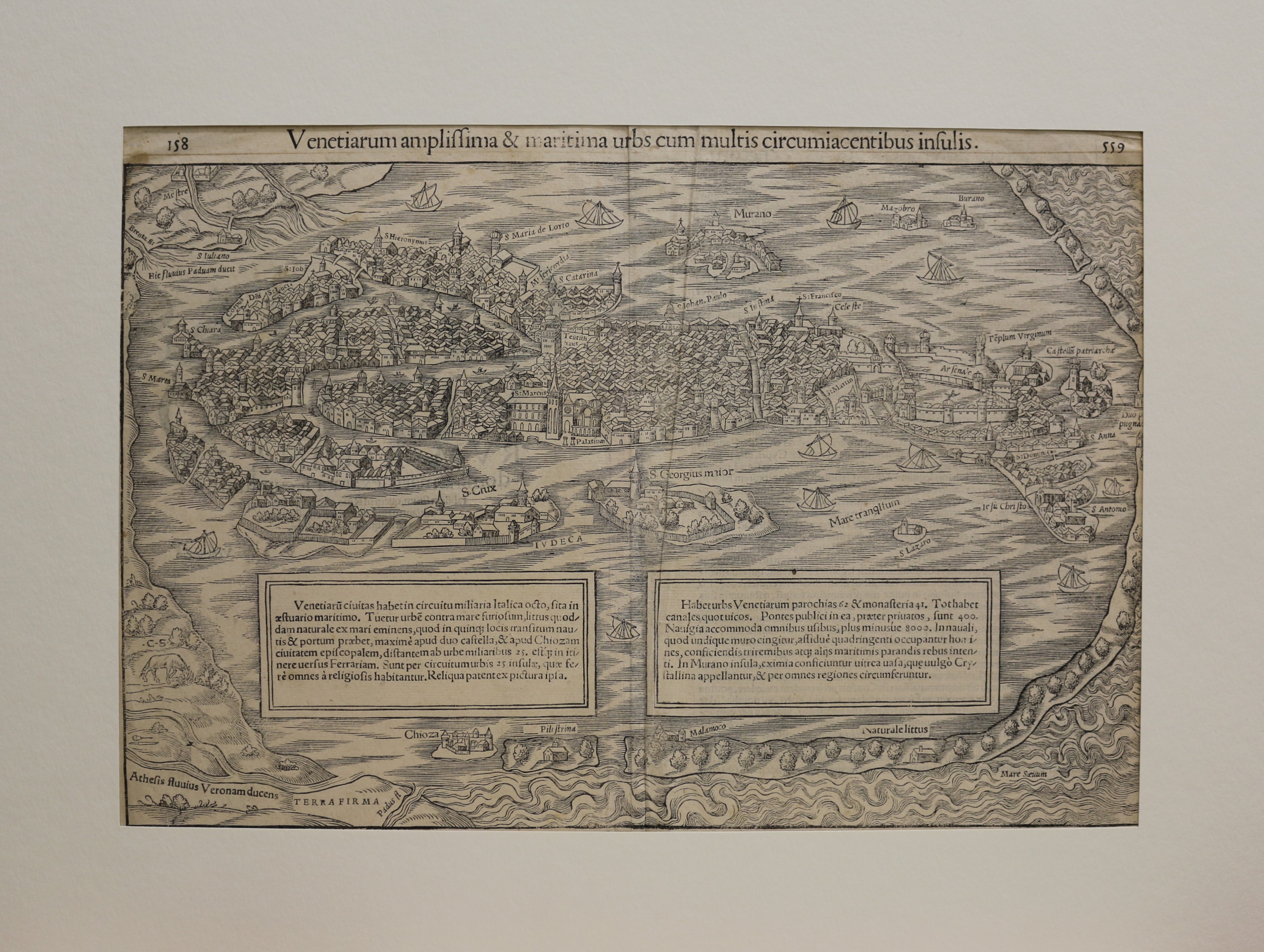Venedig: Venezia: Venetiarum amplissima & maritima urbs cum multis circumiacentibus insulis. Holzschnitt von Sebastian Münster, um 1550. 24,6 x 38 cm. Passepartout: 40 x 50 cm. Links und rechts knapp beschnitten, sonst dem Alter entsprechend gut erhalten.