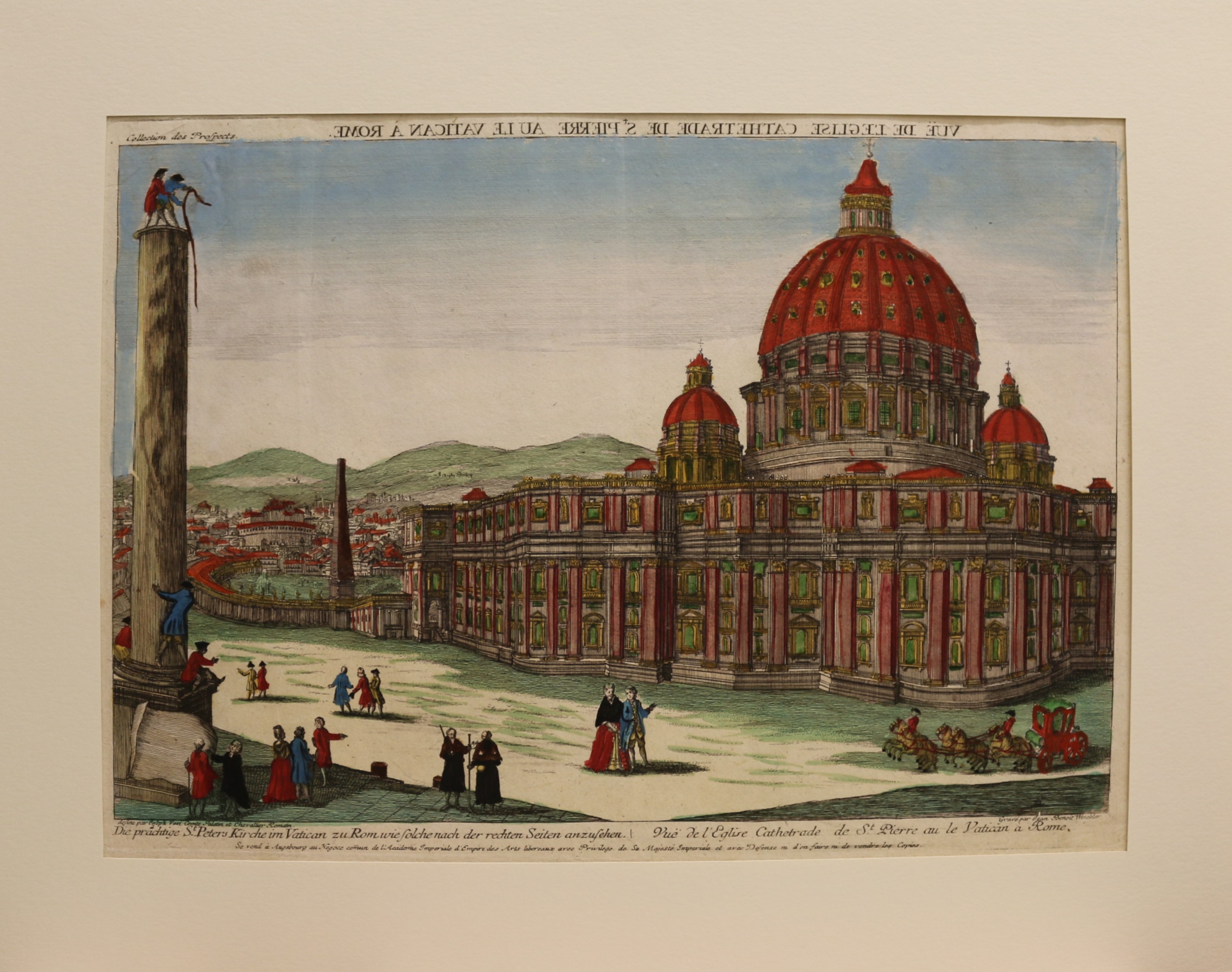 Vatican: Rom: Roma: Winckler. Die prachtige Sr. Peters Kirche im Vatican zu Rom wie solche nach der rechten Seiten anzusehen. Vuë de l’Eglise Cathetrade de St. Pierre au le Vatican a Rome. Kupferstich von Jean Benoit Winckler nach Joseph Vasi in der Akademie in Augsburg um 1760 erschienen. Engraved by Jean Benoit Winckler after Joseph Vasi, by Académie Impériale, Augsburg ca. 1760. 26,6 x 39,4 cm. Passepartout: 40 x 50 cm. Gut erhalten. Optica of Saint Peter’s Basilica (Vatican).