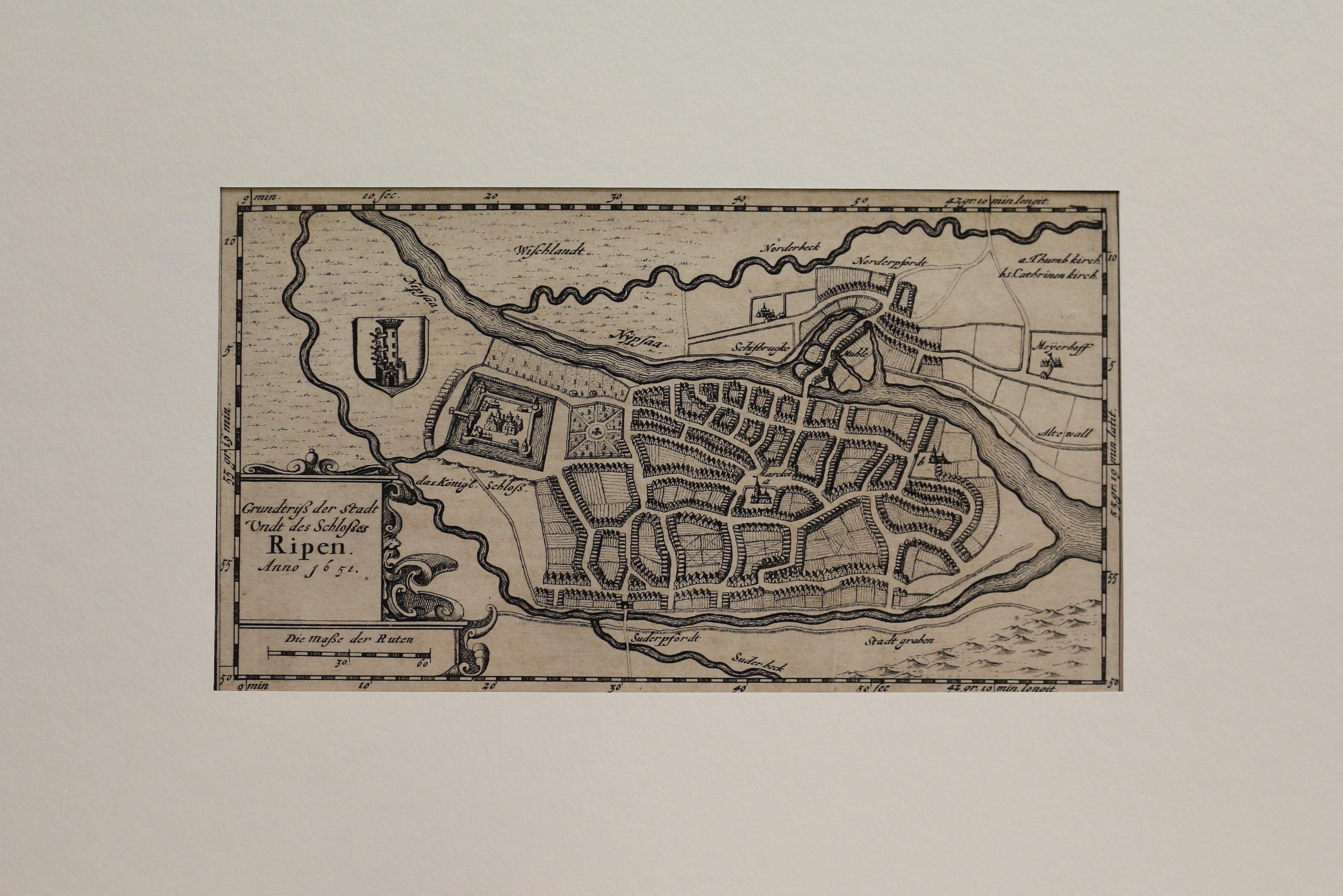 Ripen: Denmark: Grundriß der Stadt und des Schloßes Ripen. Kupferstich bei Danckwerth, 1652. 13, 5 x 24,5 cm. Passepartout: 30 x 40 cm. Gut erhalten. Ribe is Denmark’s oldest city, dating to the 8th century.
