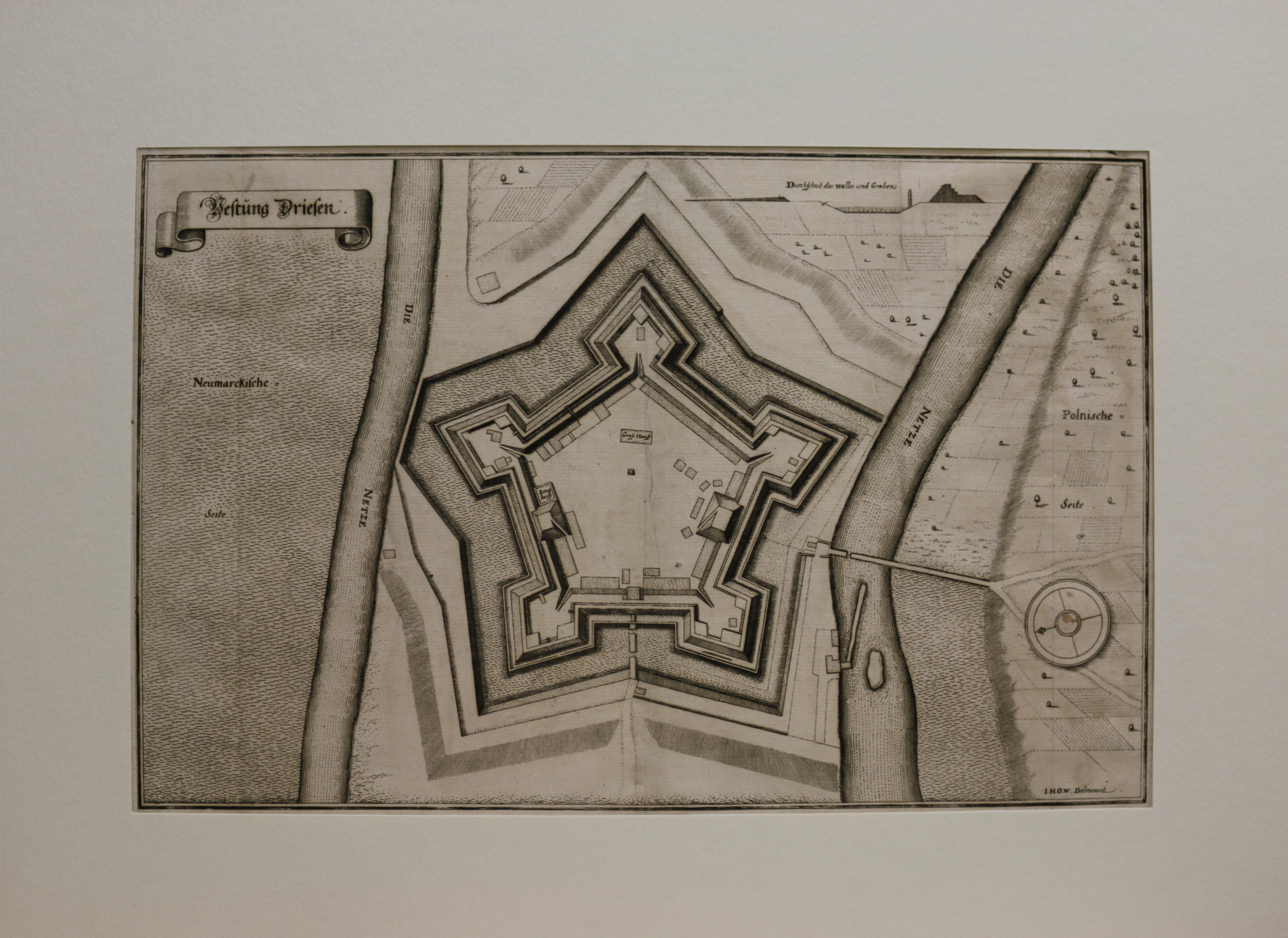 Driesen: Drezdenko: Befestigungsgrundriß: Vestung Driesen. Kupferstich aus Topografie Brandenburg und Pommern, 1652 bei Matthäus Merian seel. Erben erschienen. 22,5 x 35 cm. Passepartout: 40 x 50 cm. Gut erhalten.