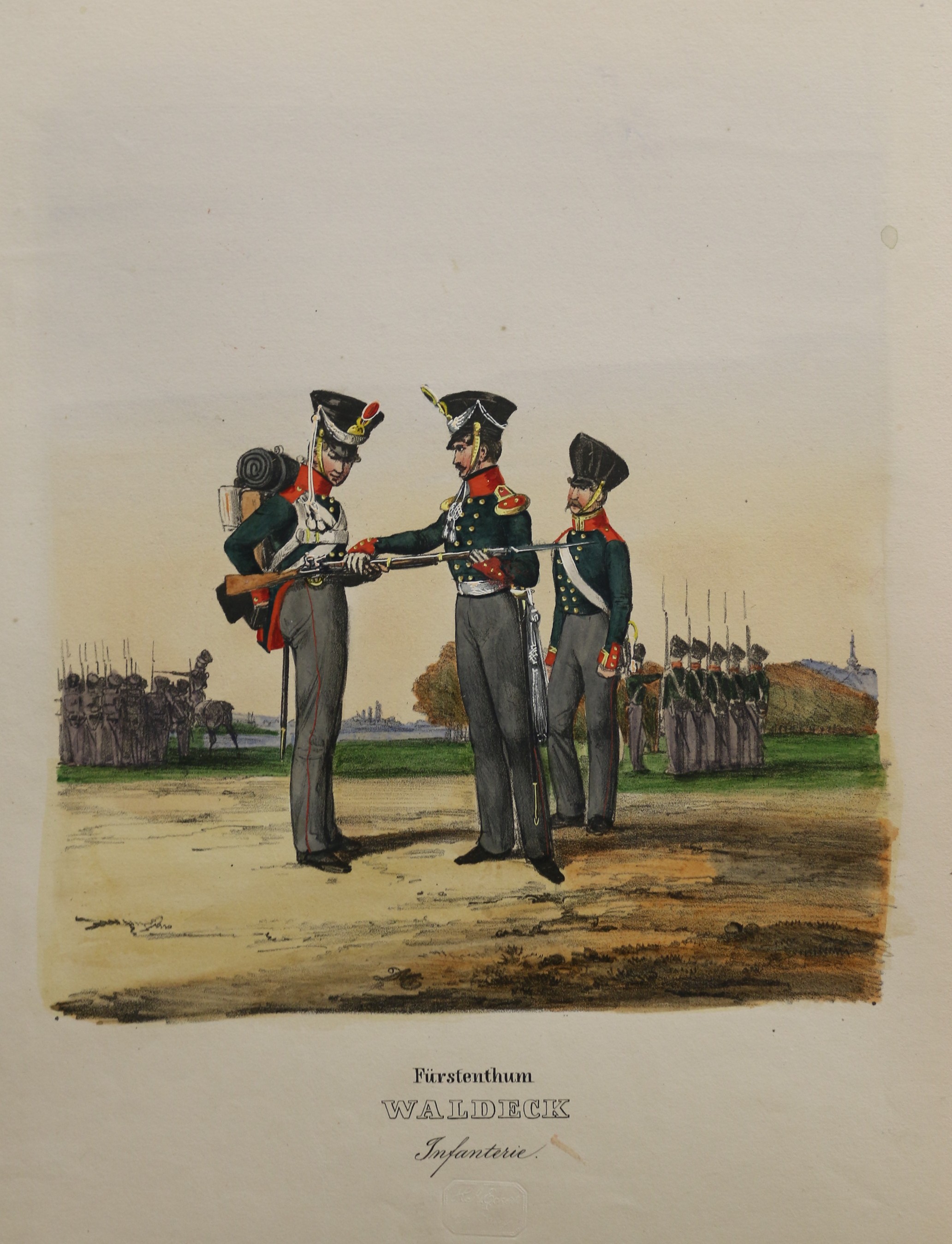 Uniformen: Eckert: Das deutsche Bundesheer: Fürstenthum Waldeck Infanterie. altkolorierte Lithographie, bei H. A. Eckert & Christian Weiß in München erschienen, 1838. Das deutsche Bundesheer in charakteristischen Gruppen. 24 x 21,5 cm. Blattformat: 37 x 25,2 cm. Wenig fleckig, sonst gut erhalten.