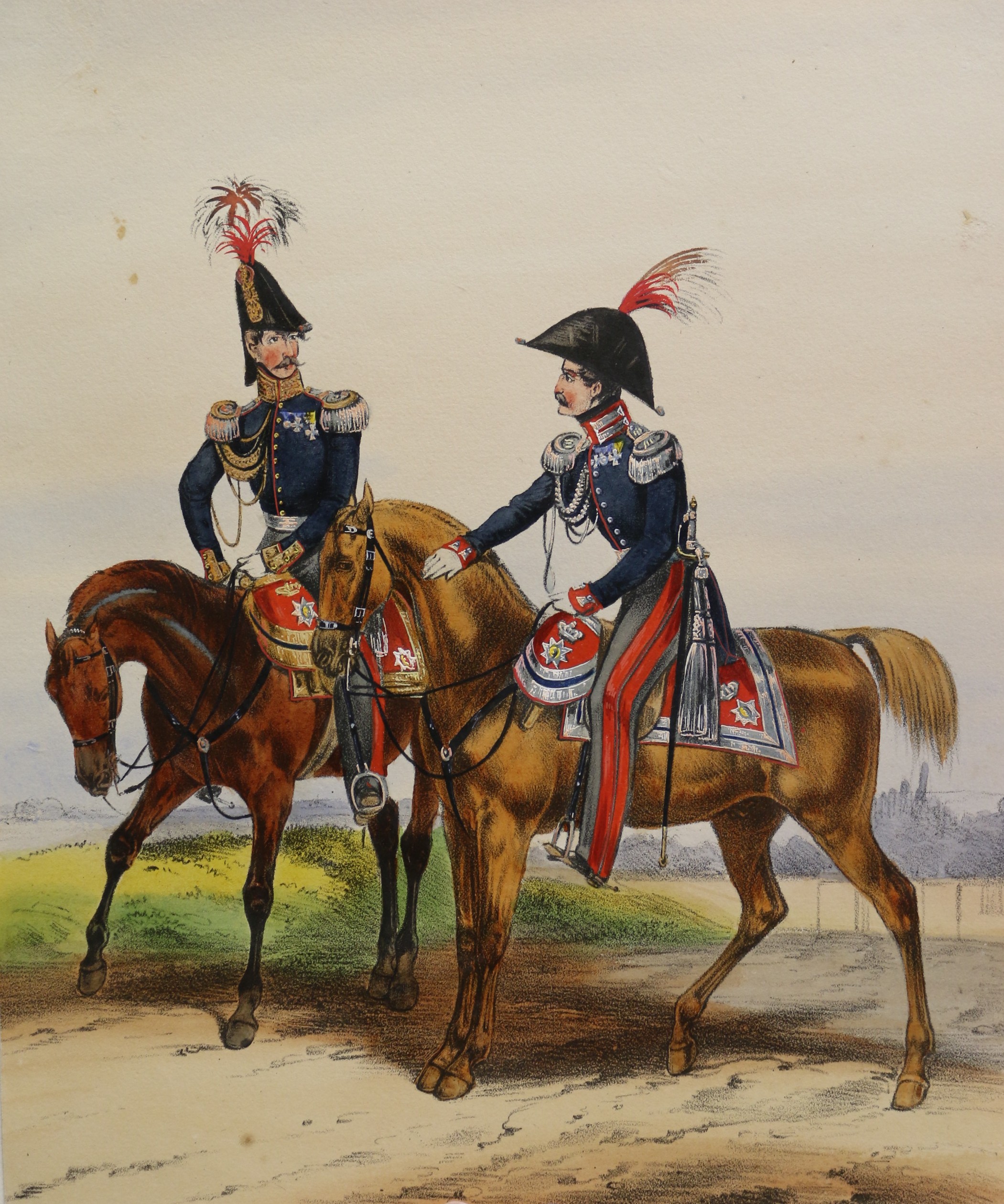 Uniformen: Eckert: Das deutsche Bundesheer: Electorat Hesse. altkolorierte Lithographie, bei H. A. Eckert & Christian Weiß in München erschienen, um 1840. Das deutsche Bundesheer in charakteristischen Gruppen. 25 x 21 cm. Blattformat: 37 x 25,2 cm. Gut erhalten.