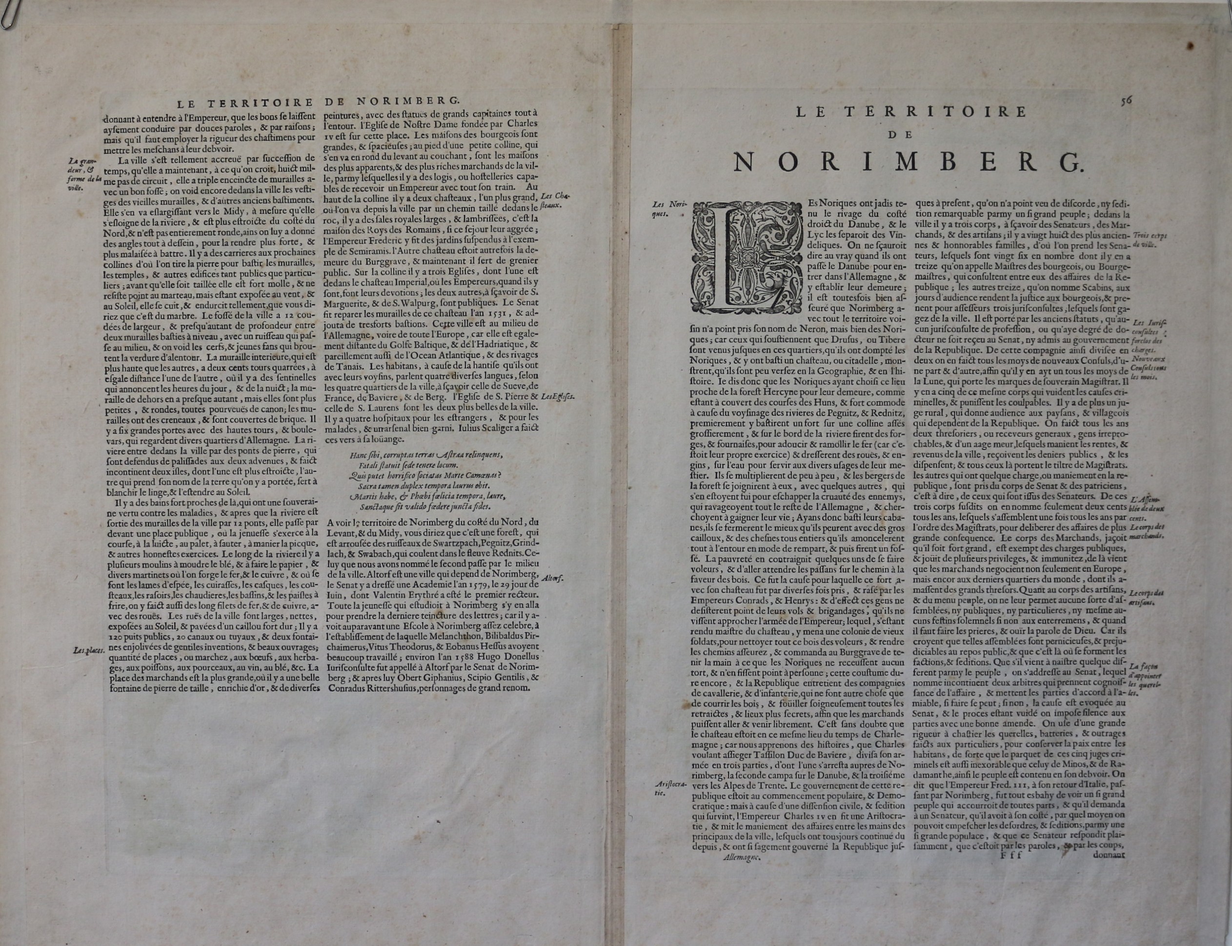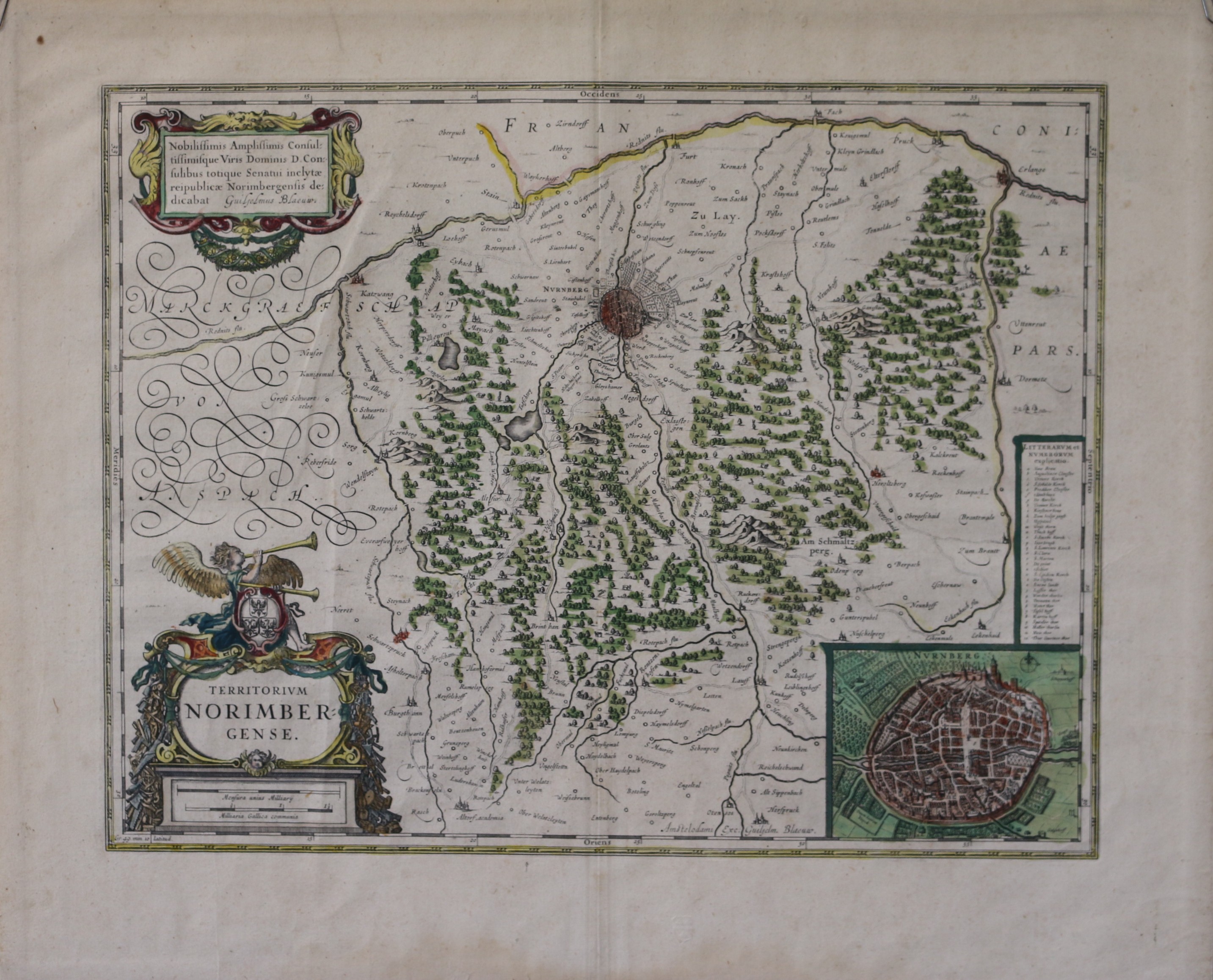Nürnberg: Territorium Norimbergense. Kolorierter Kupferstich bei Willem J. Blaeu, um 1640 36,5 x 46 cm. Blattformat: 47 x 58 cm. Gut erhalten. Westorientierte Karte.