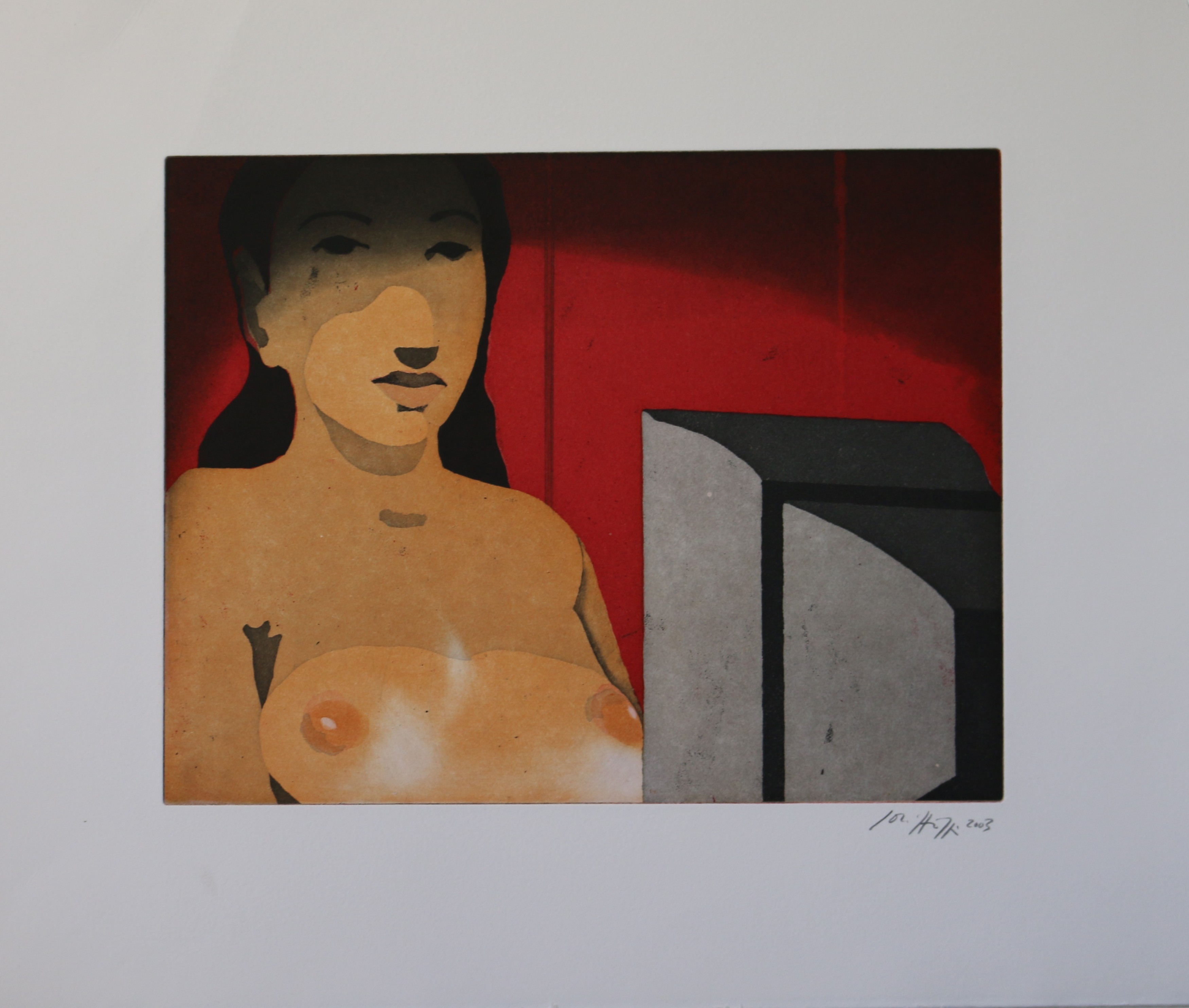 Bildschirm: Fernseher: Hüppi: Frau: Hüppi Johannes. Vor dem Bildschirm 1. Farbradierung von J. Hüppi, Druck bei Wolfgang Keller, Neustadt/Weinstrasse, Griffelkunst Hamburg, 2003. Nr.: 310 B1. 23 x 29,5 cm. Blattformat: 36,3 x 45 cm. Gut erhalten. Signiert und datiert mit Bleistift.