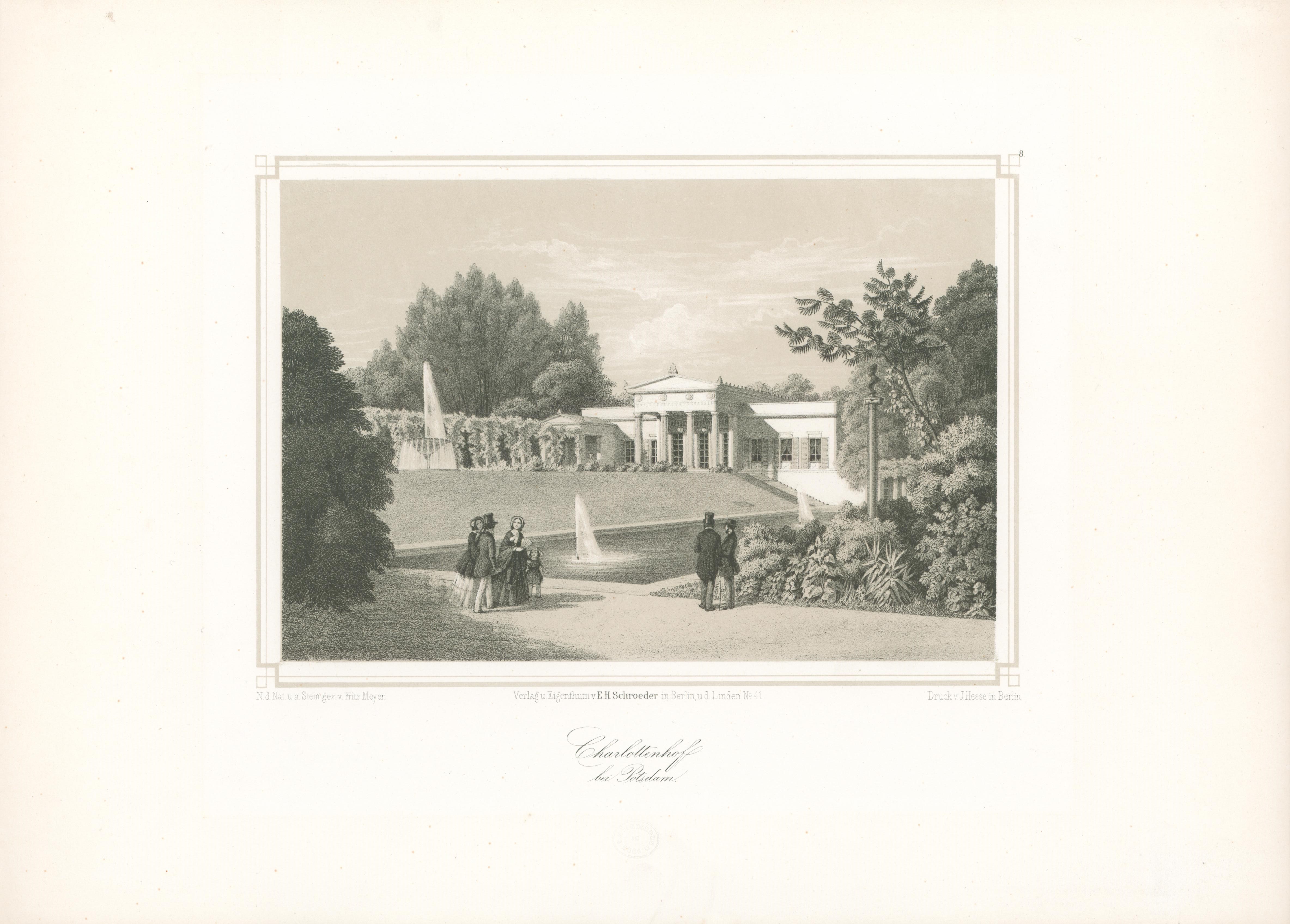 Potsdam: Charlottenhof: Fritz Meyer. Charlottenhof bei Potsdam. Lithografie von und nach Fritz Meyer, bei Schroeder in Berlin erschienen, um 1855. 16,5 x 23,6 cm inkl. Bordüre. Blattformat: 29 x 39 cm. Passepartout: 35 x 45 cm oder 30 x 40 cm. Gut erhalten.