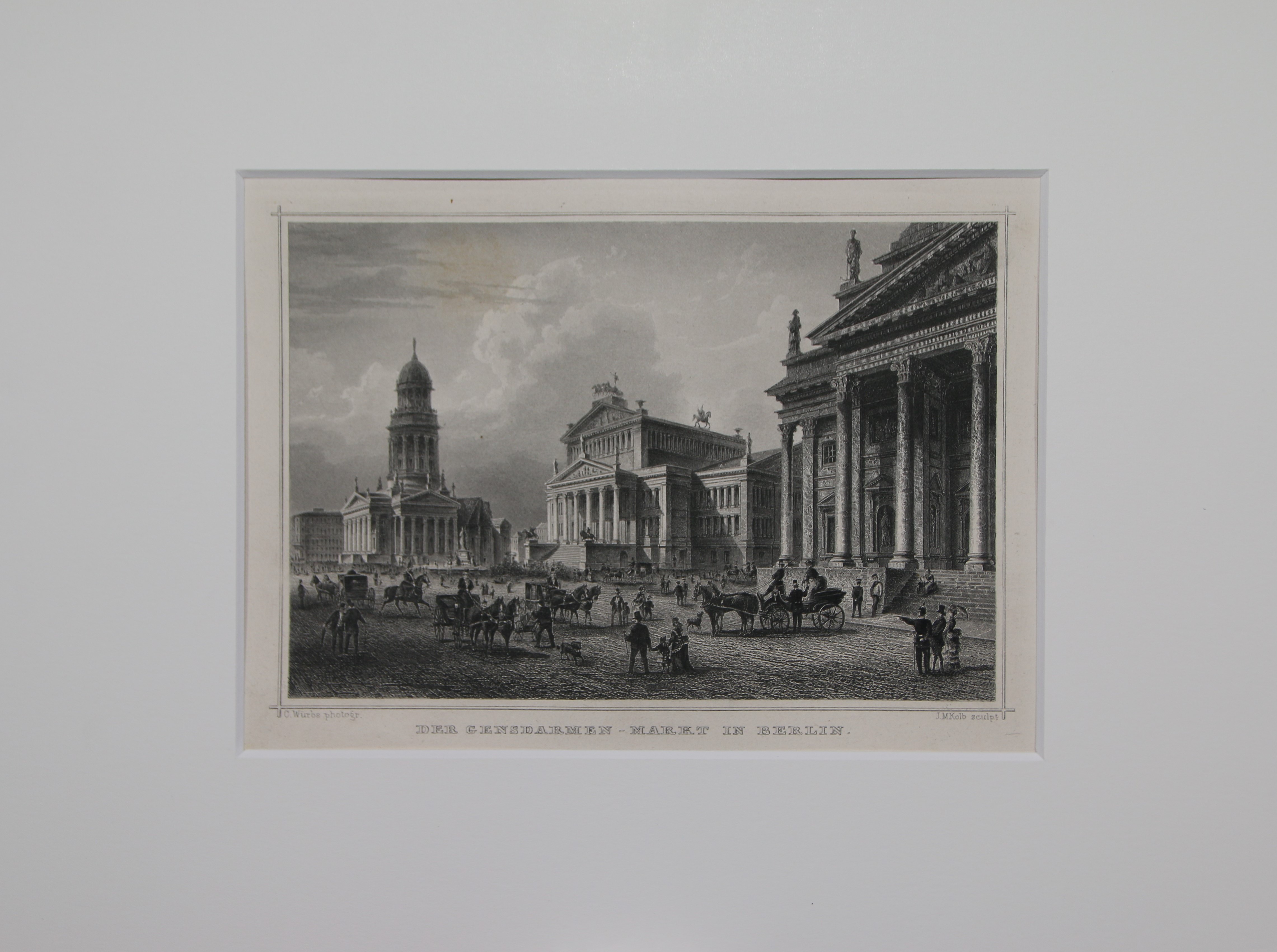 Gendarmenmarkt: Schauspielhaus: „Der Gensdarmen-Markt in Berlin.“ Stahlstich von Kolb nach Würbs, 1882. 11 x 16,5 cm. Passepartout: 24 x 30 cm. Prima erhalten. Tolle Kutschen- und Personenstaffage auf dem Gendarmenmarkt.