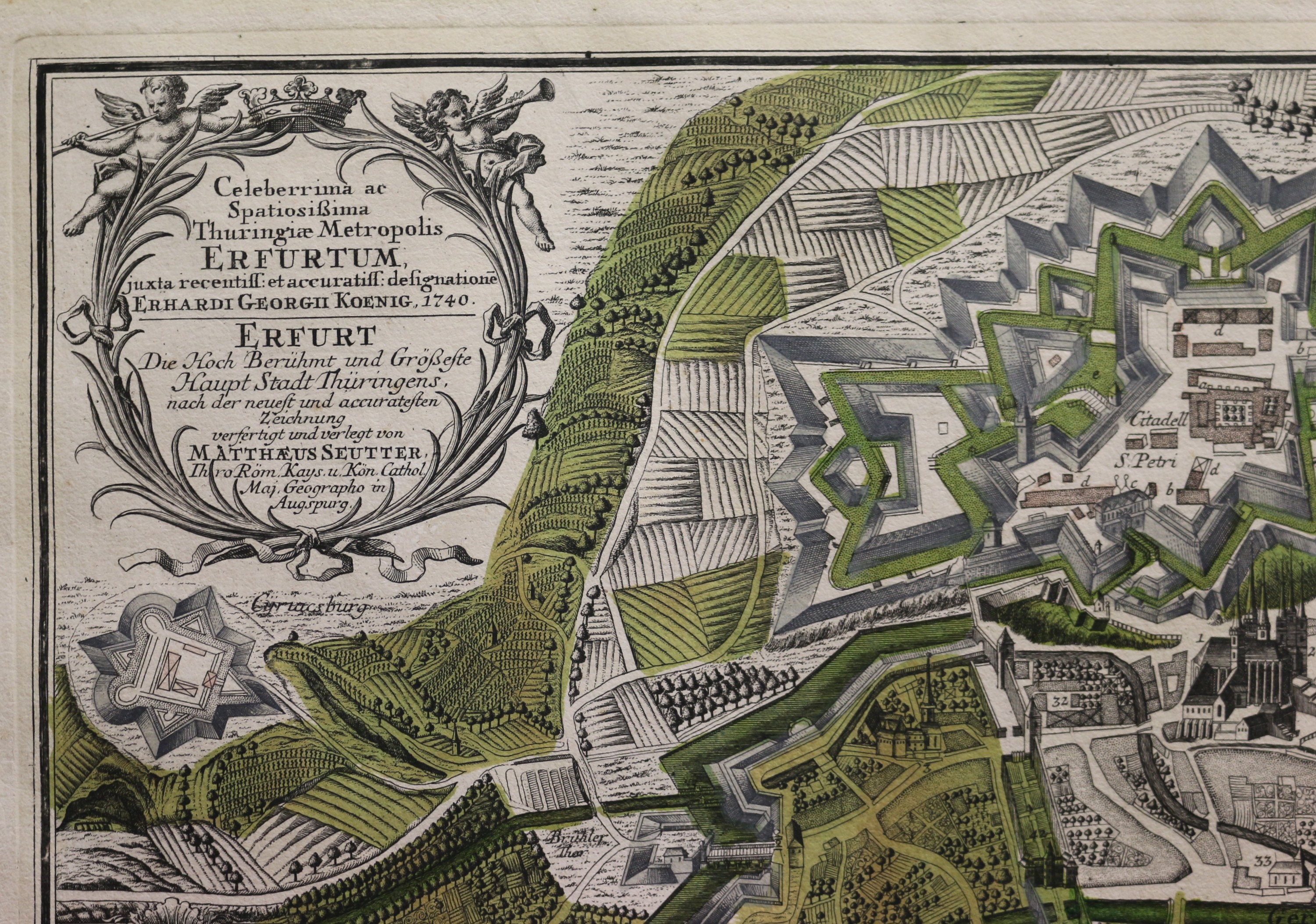 Erfurt: Plan: Gesamtansicht: Seutter. Erfurt die Hoch Berühmt und Größeste Haupt Stadt Thüringens. Celeberrima ac Spatiosißima Thuringiae Metropolis ERFURTUM. altkolorierter Kupferstich, Matthäus Seutter, um 1740. 49 x 56,5 cm. Blattformat: 49 x 64 cm. Einige Einrisse und Stockflecken an den Rändern, sonst gut erhalten. Schöner Plan & Gesamtansicht von Erfurt, oben links die Titelkartusche, darunter Erklärungen.
