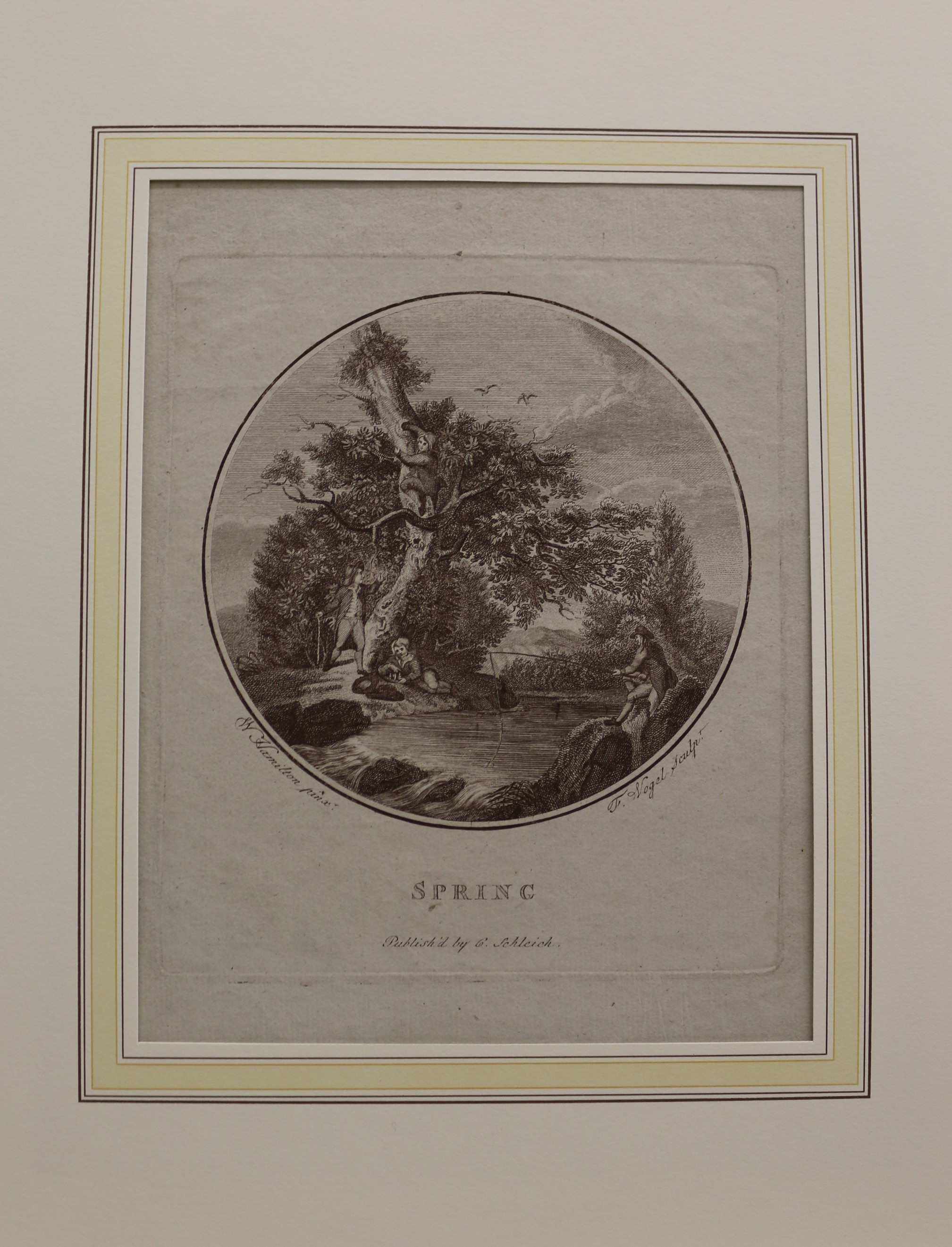 Spring: Frühling: Jahreszeiten: Spring. Radierung von Vogel nach W. Hamilton bei G. Schleich, um 1800. Seltenes Blatt. 13,5 x 14 cm im Rund. Passepartout: 26 x 35 cm. Gut erhalten.