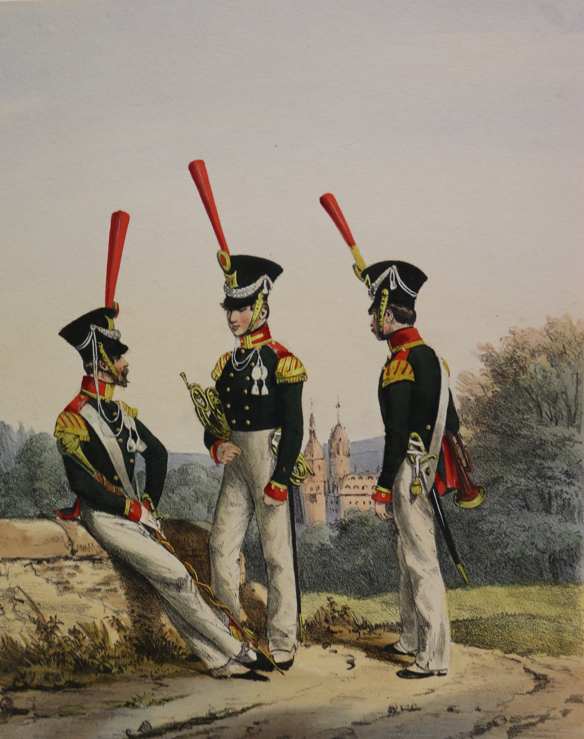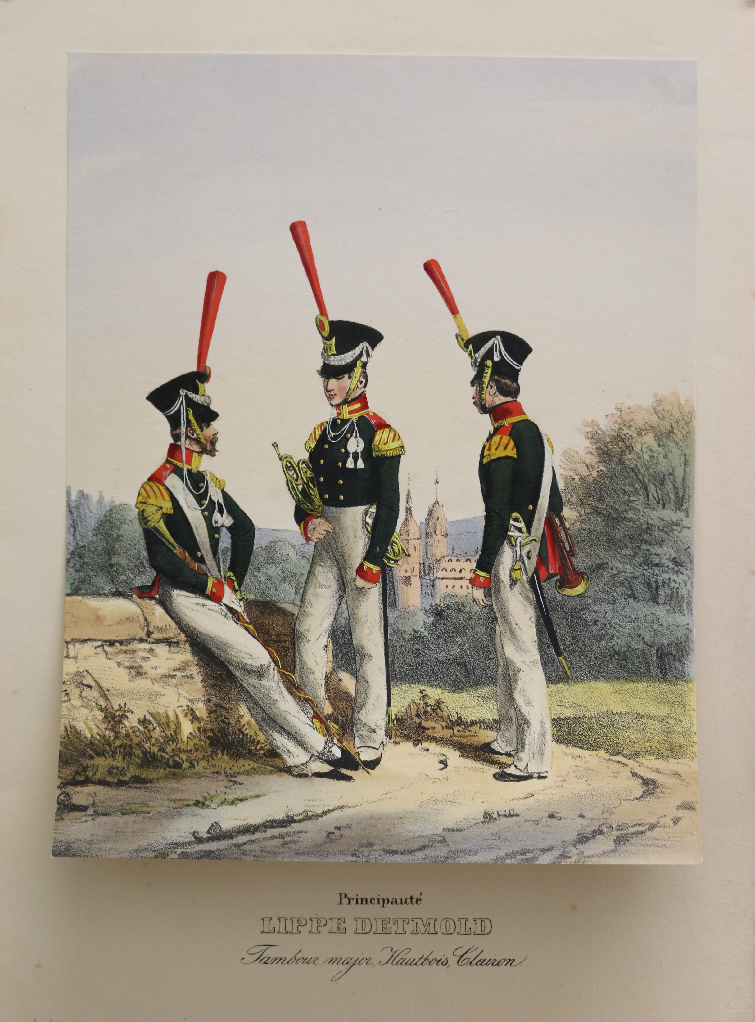 Uniformen: Eckert: Das deutsche Bundesheer: Principauté Lippe Detmold altkolorierte Lithographie, bei H. A. Eckert & Christian Weiß in München erschienen, 1838. Das deutsche Bundesheer in charakteristischen Gruppen. 25,2 x 19,7 cm. Blattformat: 36,5 x 25,5 cm. Gut erhalten. Der Rand etwas angestaubt.