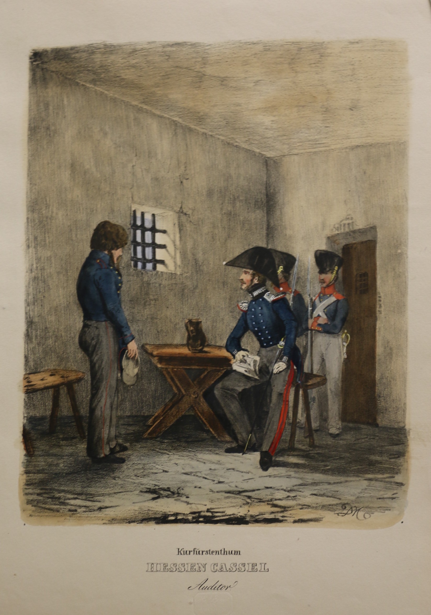 Uniformen: Eckert: Das deutsche Bundesheer: Kurfürstenthum Hessen Cassel Auditor. altkolorierte Lithographie, bei H. A. Eckert & Christian Weiß in München erschienen, um 1840. Das deutsche Bundesheer in charakteristischen Gruppen. 22,5 x 20,8 cm. Blattformat: 37 x 25,2 cm. Gut erhalten.